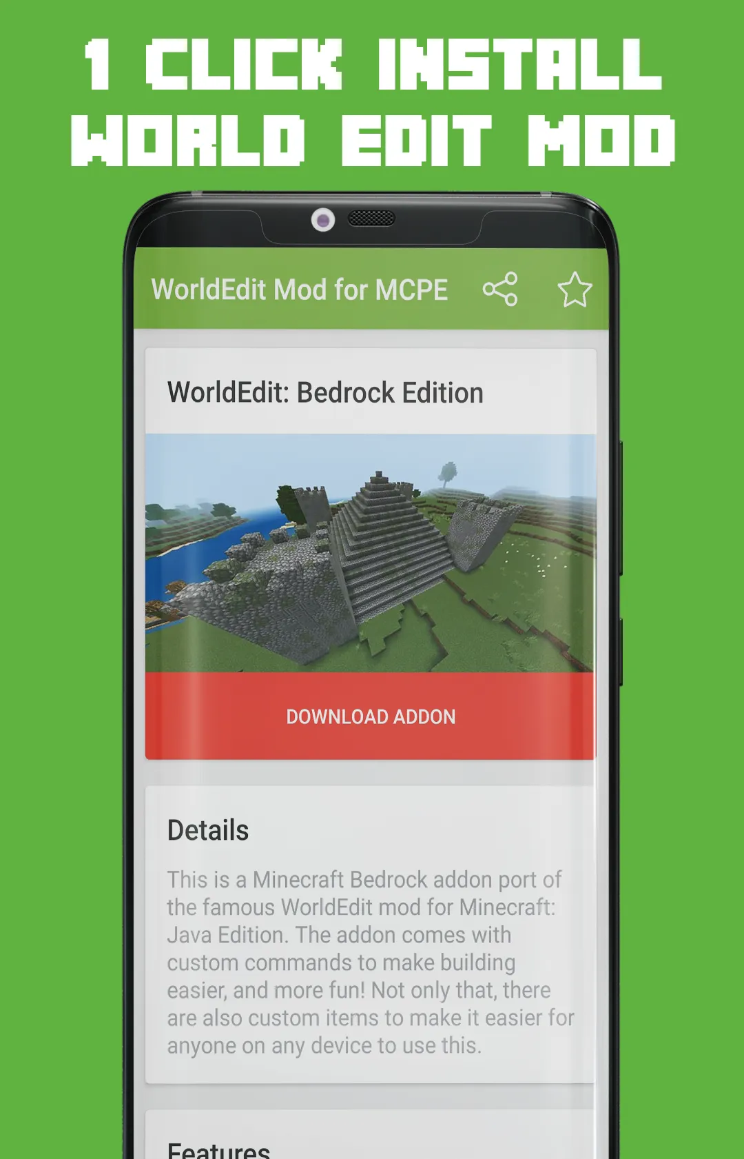 WorldEdit Mod for Minecraft PE is an application that allowed you to easily download & install WorldEdit: Bedrock Edition Add-on to Minecraft Pocket Edition game in your Android devices. Thanks to our 1-Click installer that make it super easy to install Minecraft Mods, Addons, Maps, Skins, and Texture Packs. With the WorldEdit Addon, new custom commands were added to your Minecraft Bedrock to make building easier and more fun! APP Features: ☑️ One click download and install...