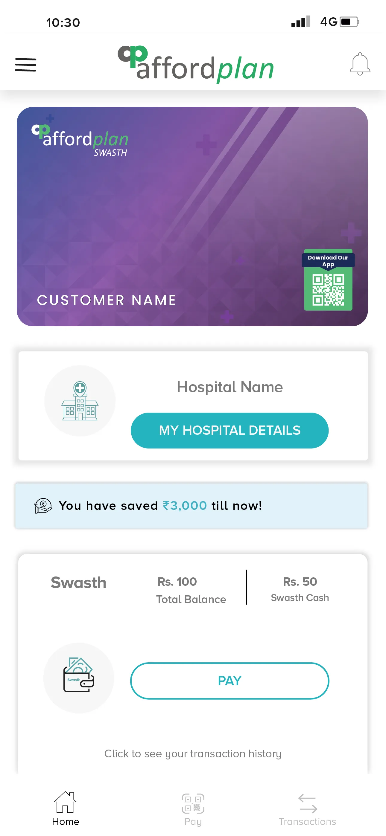 Affordplan Swasth is a healthcare savings card created keeping in mind your healthcare financial needs. Through this card, access offers at your preferred hospital that let you save on each medical bill while giving you a host of other value-added services. - Cashback on each spend at the hospital including - Bonus cash to kickstart your first transaction - Health insurance - Home delivery of medicines...