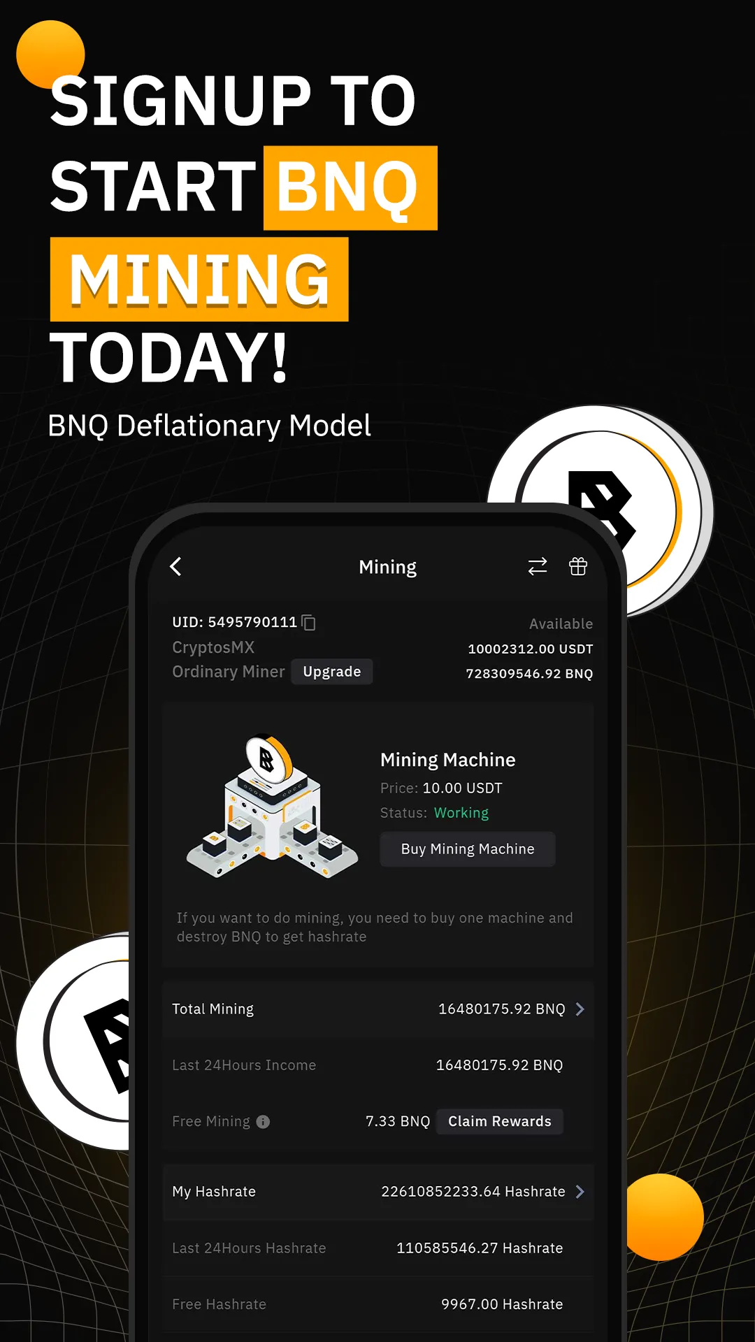 BitNasdaq, building an ecosystem of successful buying and selling of cryptocurrency, and BNQ Mining with a Deflationary Economic Model. Download the leading app today and grow your investments with our latest features. Mine BNQ BNQ Mining, the first ever Deflationary Economic Model for mining launched by BitNasdaq, represents the next generation of cryptocurrency mining. Unlike traditional mining, which consumes substantial resources, BNQ Mining uses two consensus mechanisms for mining, the Proof of Work (POW) + Proof of Contribution (POC) model. This hybrid approach creates a faster and more sustainable framework for token generation and value appreciation. Burn to mine more, all you have to do is download the BitNasdaq app, sign up, complete your KYC, and get your Mining Machines. The more Mining Machines you own, the higher your Mining Level, the bigger the Mining Reward. It’s simple, it’s rewarding, and it’s made for you. ...