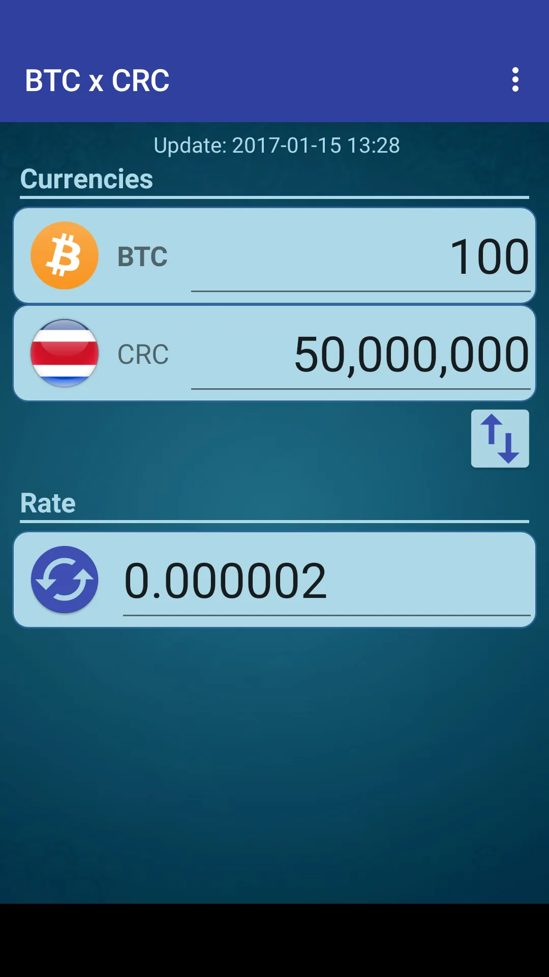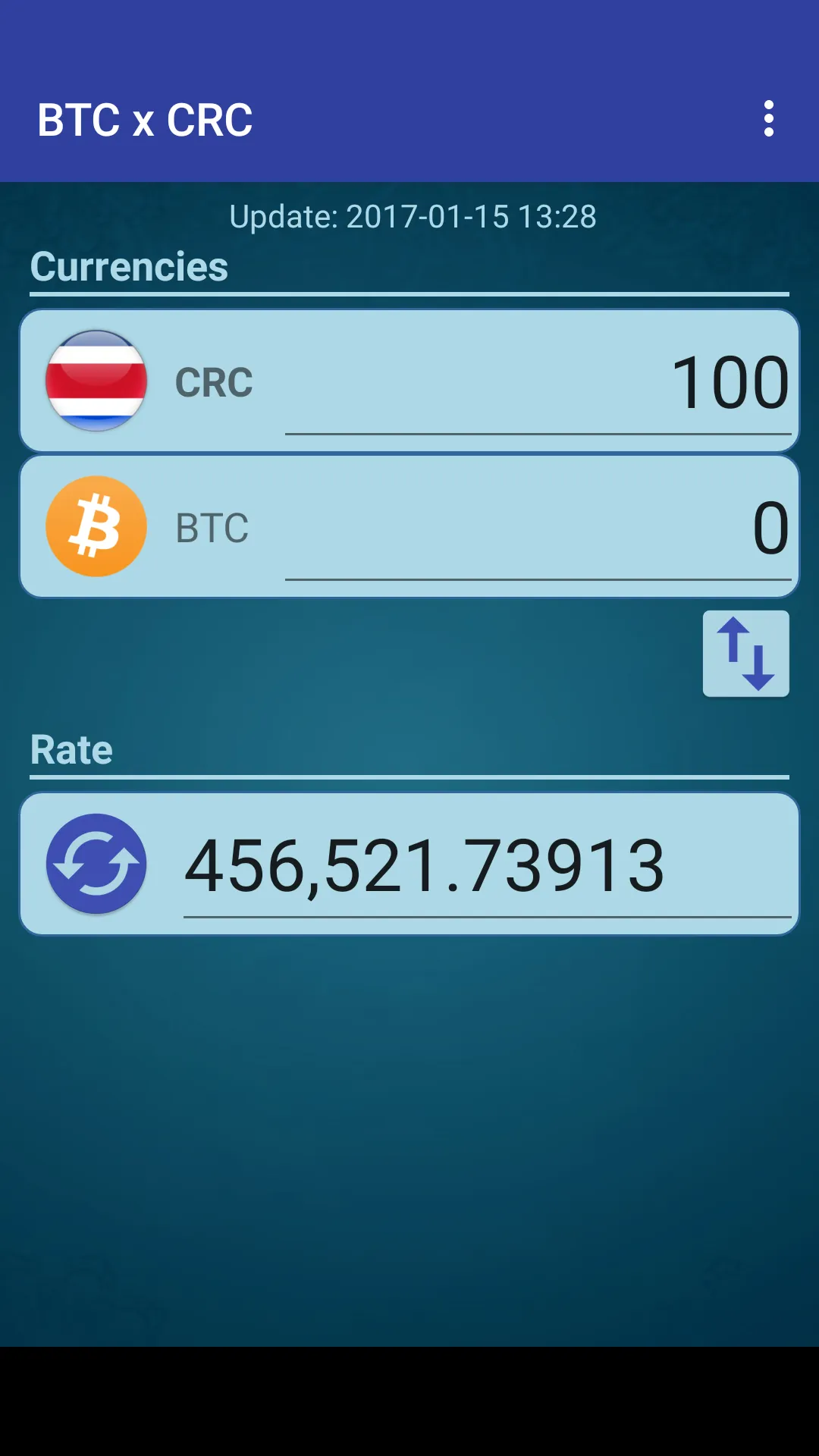 A simple currency converter from Bitcoin to Costa Rican Colón and from Costa Rican Colón to Bitcoin. This application includes the following features: - Currency converter - Exchange rate online - Allows you to change the rate manually to the rate of your choice Bitcoin x Costa Rican Colón (BTC CRC) Costa Rican Colón x Bitcoin (CRC BTC)