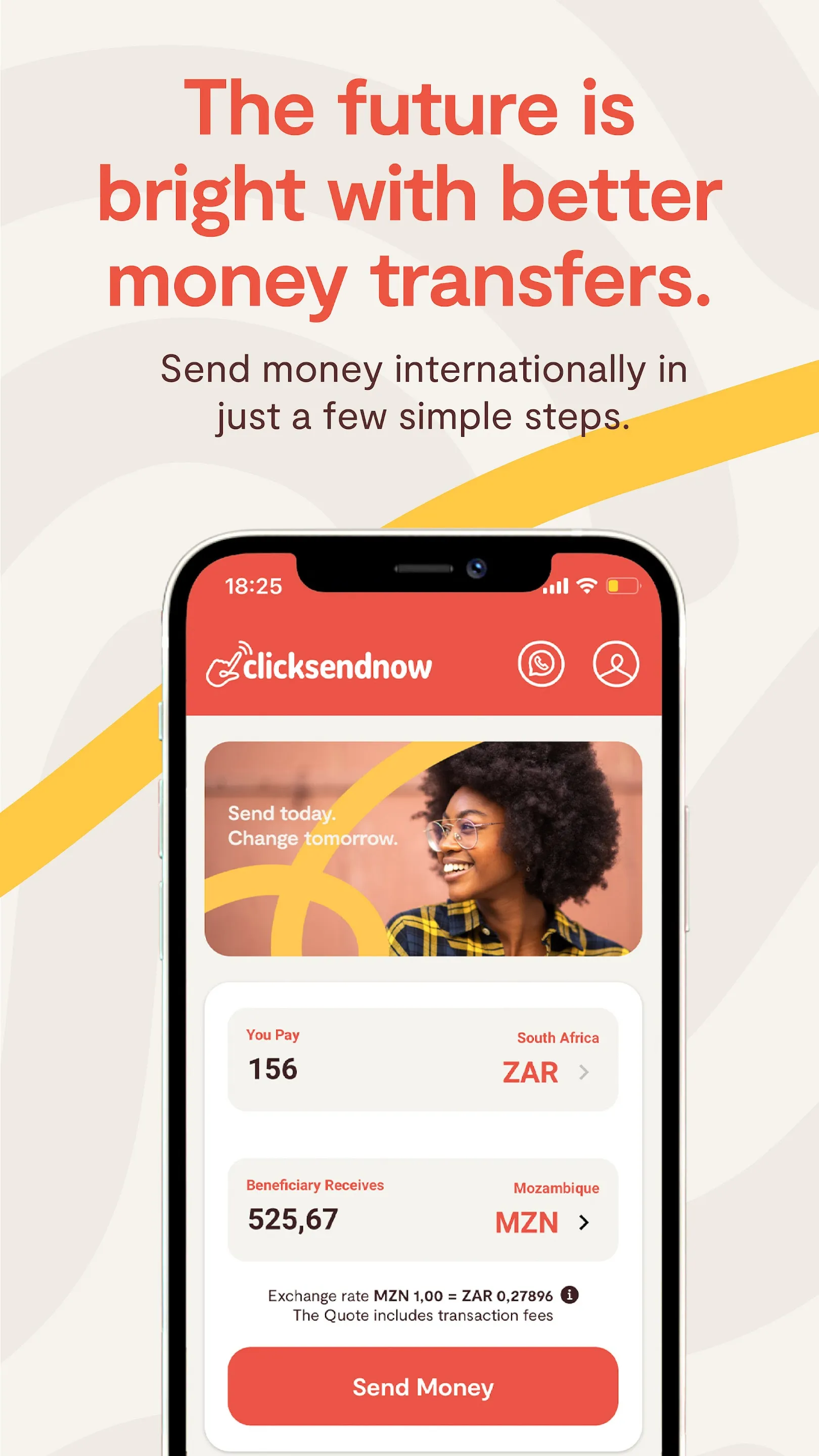 Clicksendnow offers smooth, simple and smart money management! The best part? Money transfers across Africa with multiple payout channels and only 6% in transaction fees SIGN UP Sign up is easy and can be done right from your home. Wondering what to expect? Our straightforward document scanning and security processes are all done from the app. ...