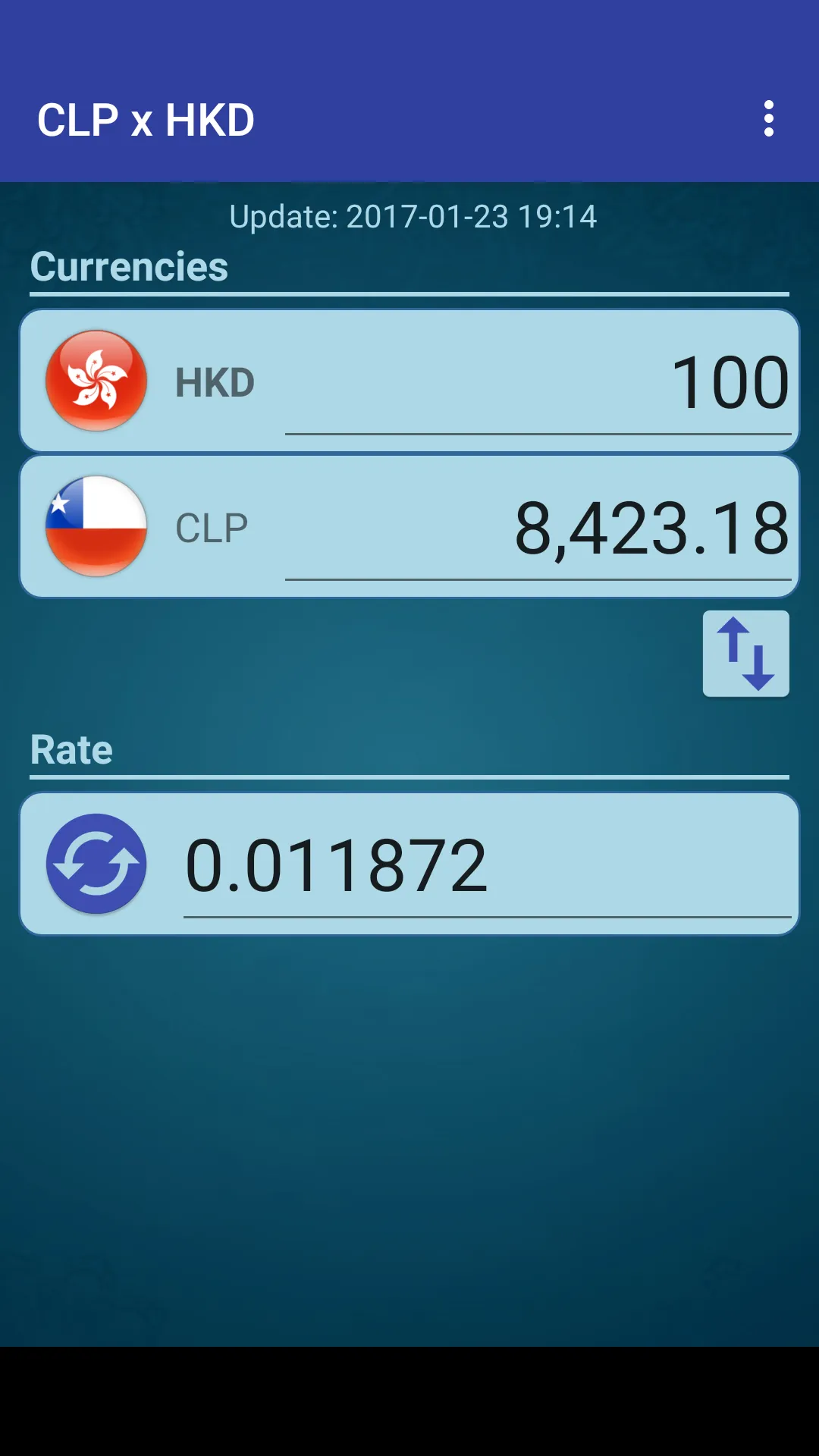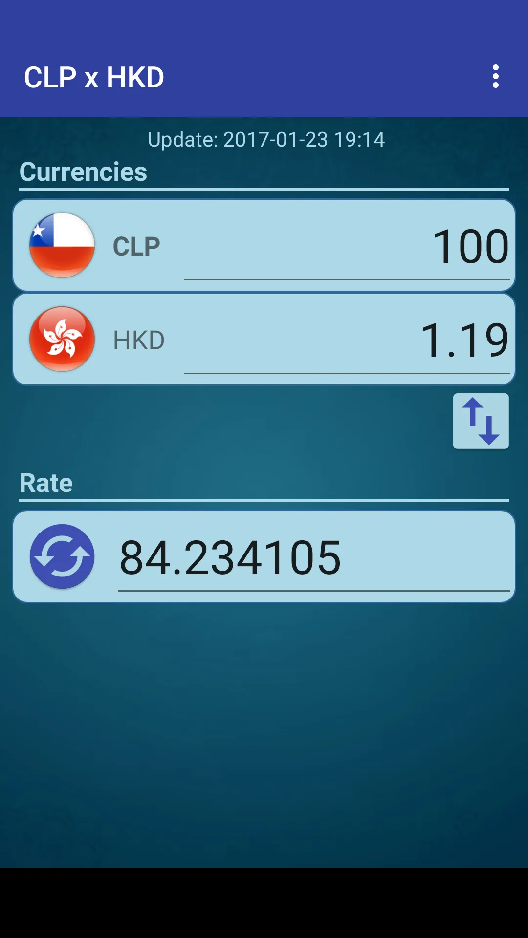 A simple currency converter from Chilean Peso to Hong Kong Dollar and from Hong Kong Dollar to Chilean Peso. This application includes the following features: - Currency converter - Exchange rate online - Allows you to change the rate manually to the rate of your choice Chilean Peso x Hong Kong Dollar (CLP HKD) Hong Kong Dollar x Chilean Peso (HKD CLP)