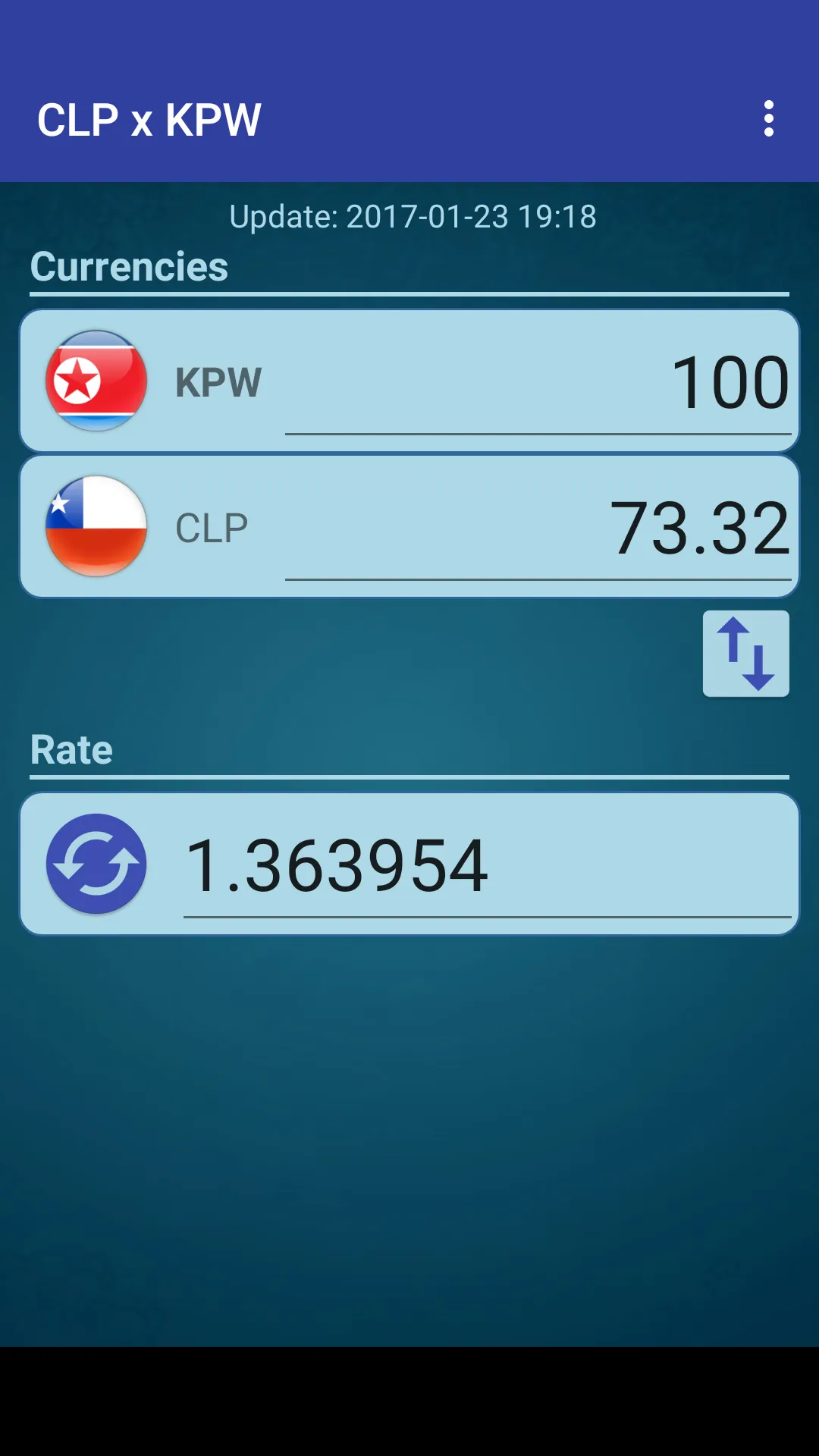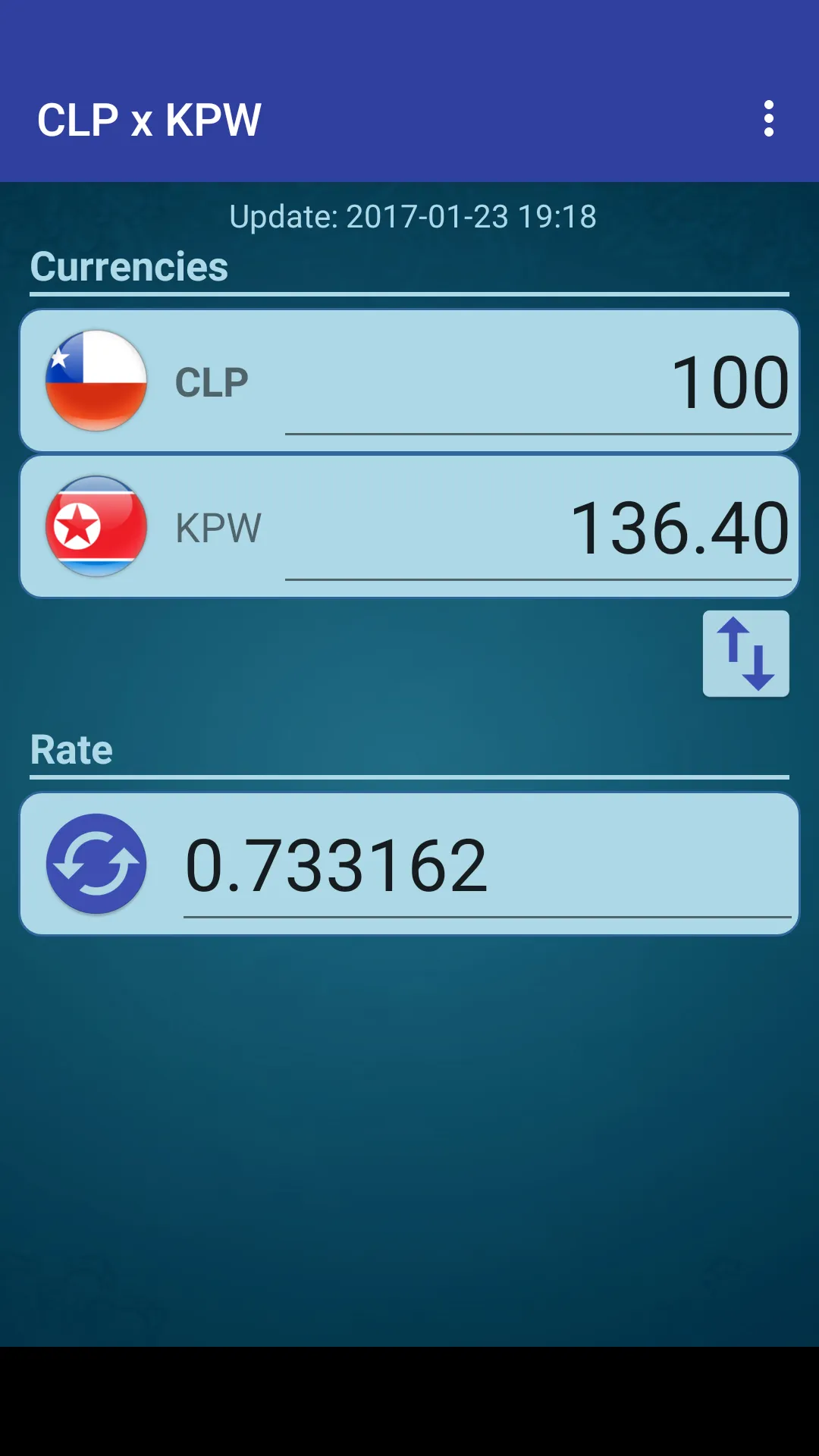 A simple currency converter from Chilean Peso to North Korean Won and from North Korean Won to Chilean Peso. This application includes the following features: - Currency converter - Exchange rate online - Allows you to change the rate manually to the rate of your choice Chilean Peso x North Korean Won (CLP KPW) North Korean Won x Chilean Peso (KPW CLP)
