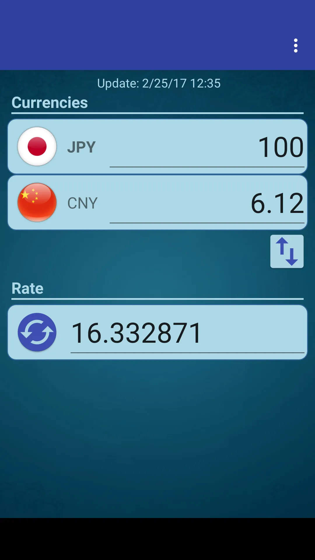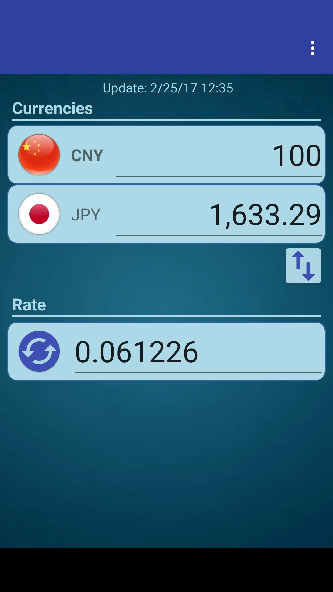 A simple currency converter from Chinese Yuan to Japanese Yen and from Japanese Yen to Chinese Yuan. This application includes the following features: - Currency converter - Exchange rate online - Allows you to change the rate manually to the rate of your choice Chinese Yuan x Japanese Yen (CNY JPY) Japanese Yen x Chinese Yuan (JPY CNY)