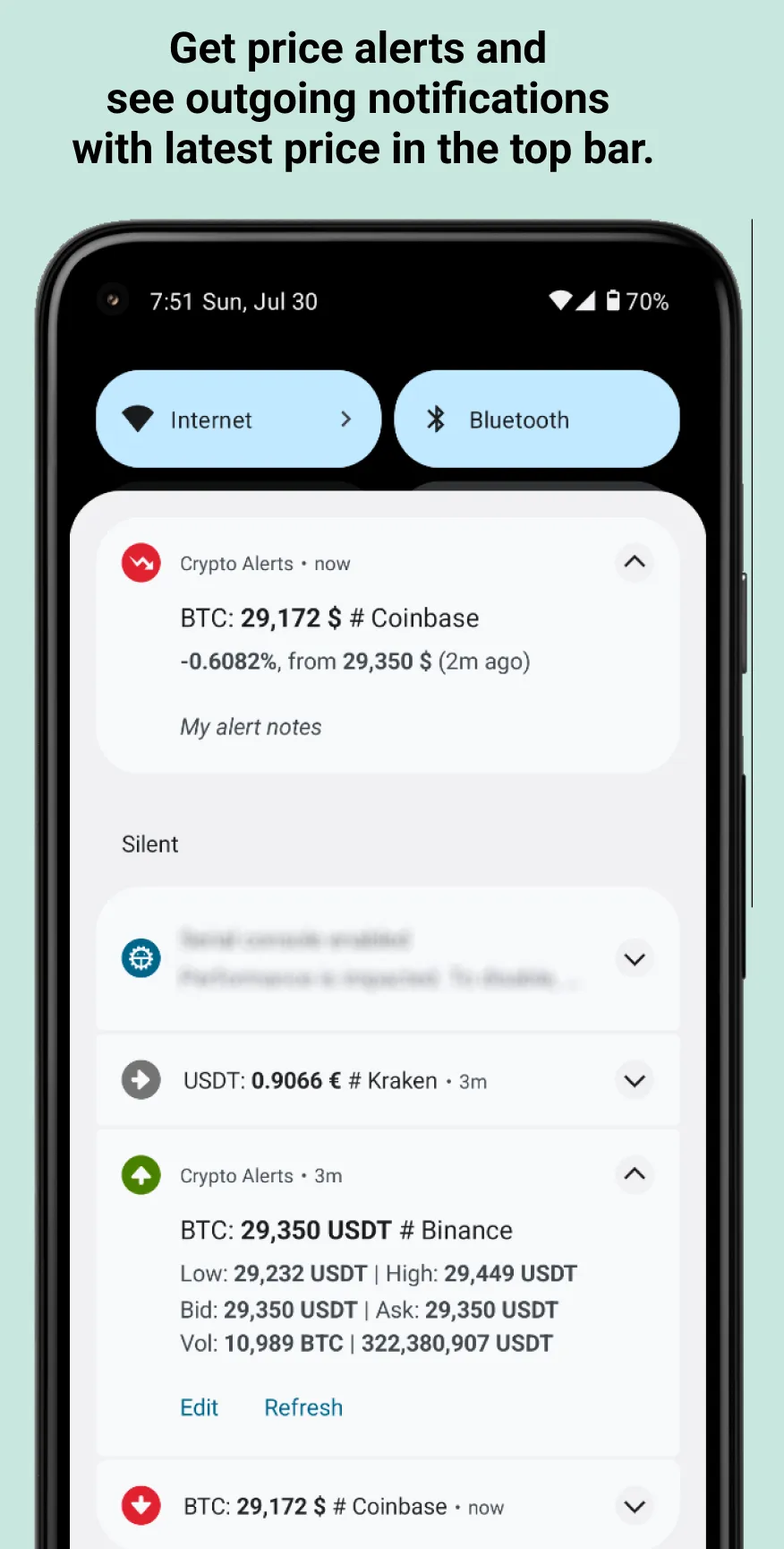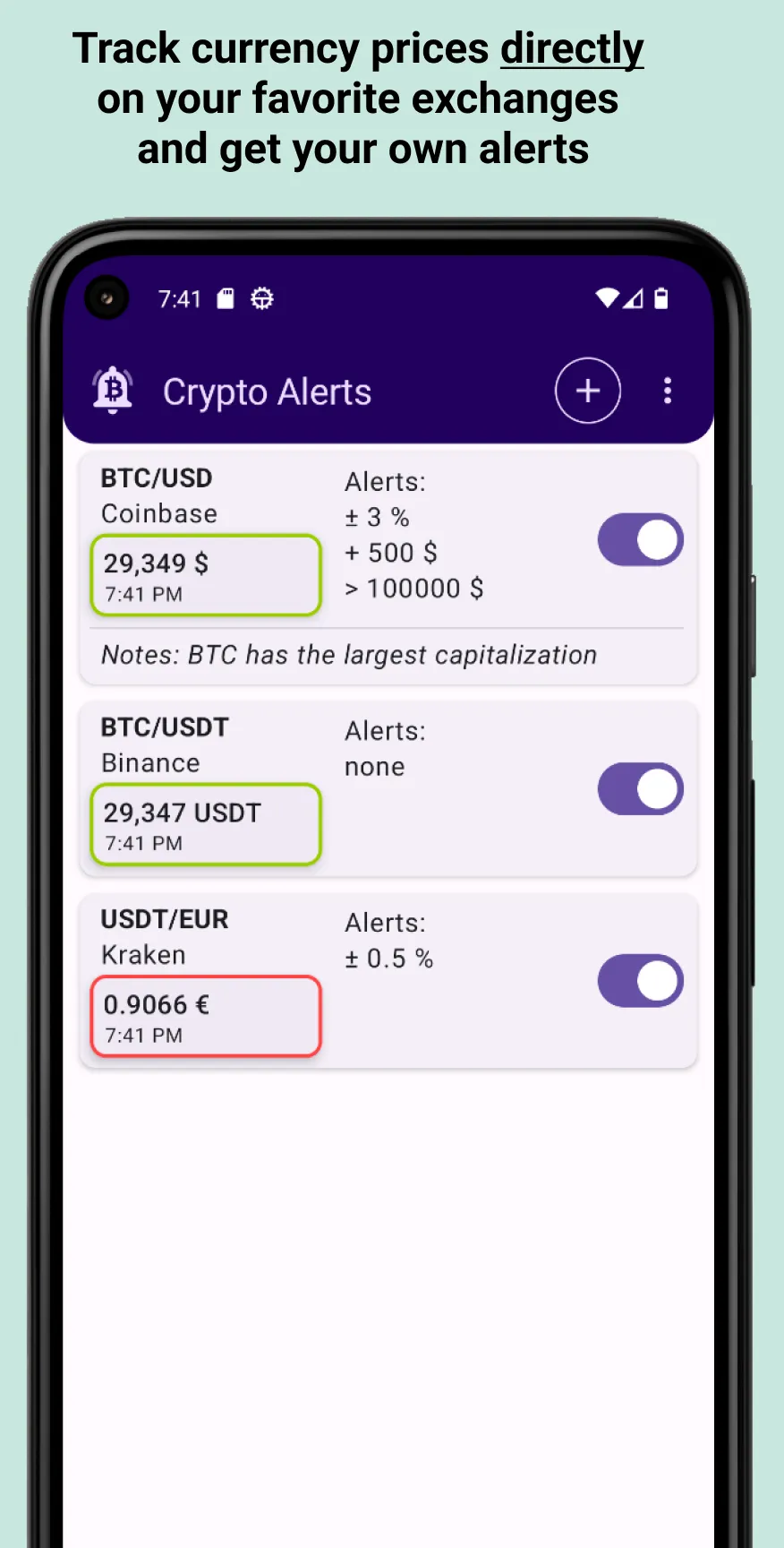 Crypto Alerts is the app for crypto enthusiasts and traders who want to keep track of the latest prices and trends of their favorite coins, including Bitcoin, Ethereum, Tether, and more. With Crypto Alerts, you can: - Choose from over 100 supported cryptocurrency exchanges and view live prices, charts, and market data - Set up custom alerts and notifications for any price changes, volume changes, or percentage changes of your selected coins - Customize your home screen with widgets that display the current prices of your favorite currency pairs...