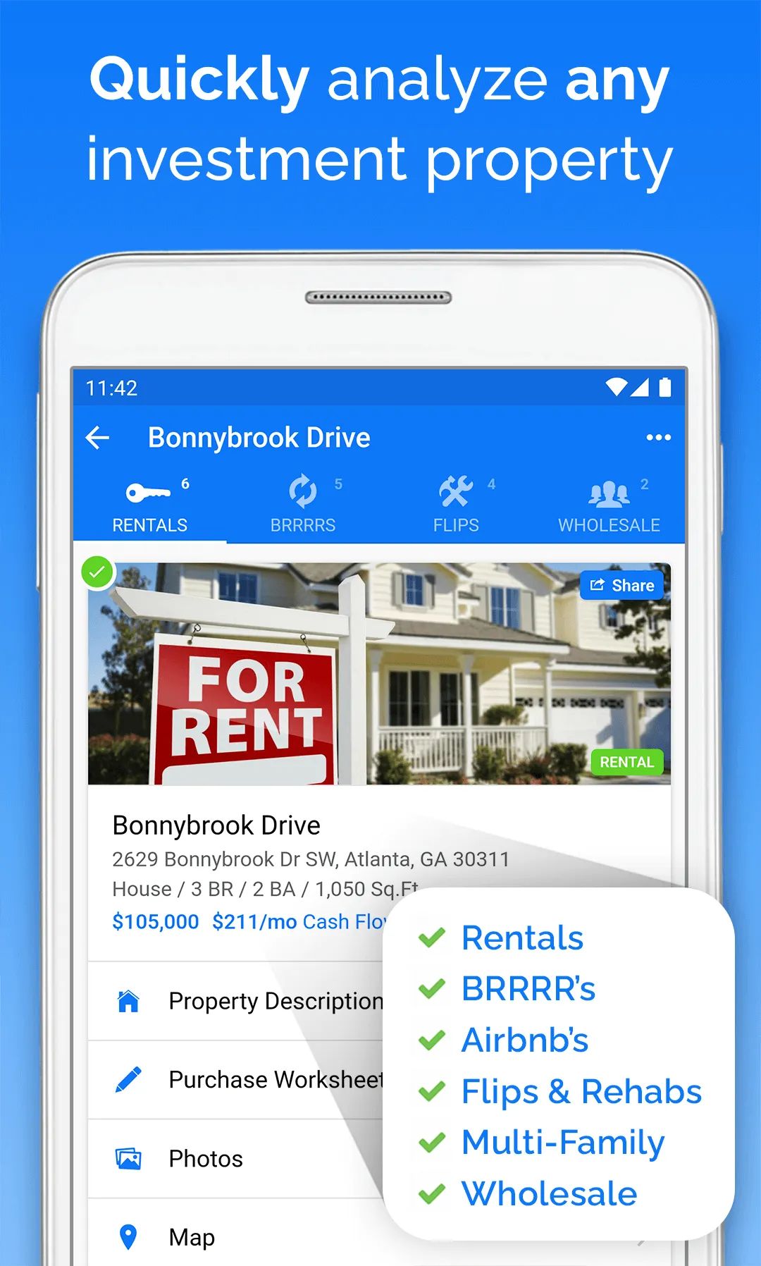 DealCheck is the simplest and fastest way to analyze and compare investment properties on your phone or tablet. Trusted by over 350,000 real estate investors and agents, it's a top-ranking real estate investing app that has been featured by Forbes, MSN, BiggerPockets and others. Whether you’re a new investor who wants to learn how to analyze investment properties, or an experienced professional who needs 24/7 access to powerful analysis, projection and reporting tools, you’ll love this real estate calculator. ...