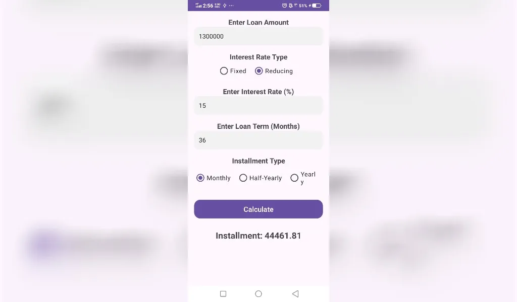 Plan your finances smarter with the EMI Calculator app! Whether you're taking a loan for a car, home, education, or business, this app is your ultimate financial assistant. With an intuitive interface and accurate calculations, managing loans has never been easier. Key Features: ✅ Installment Types: Calculate monthly, half-yearly, or yearly installments to suit your financial planning. ✅ Interest Rate Options: Choose between Fixed Interest Rate (calculated on the total borrowing amount) and Reducing Interest Rate (calculated on the diminishing balance). ✅ Accurate Results: Get precise calculations for your total loan amount, interest, and installment....