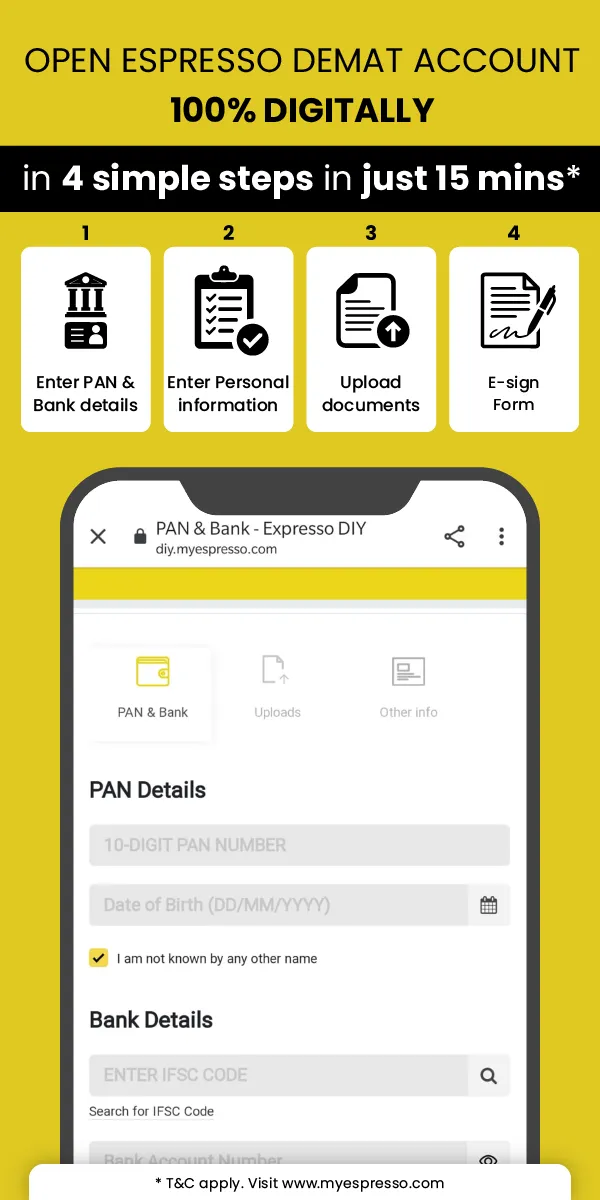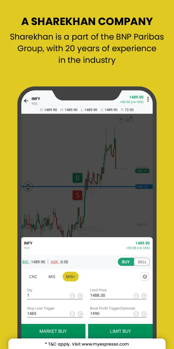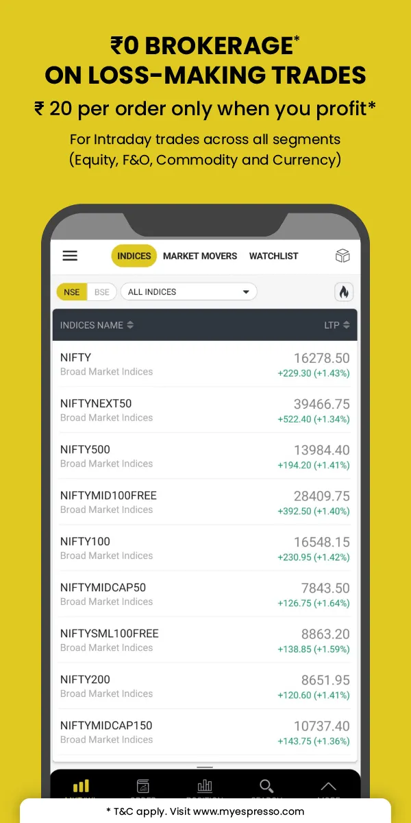 Open a Demat and Trading account 100% online with Espresso (from the House of Sharekhan) and trade/invest digitally! Espresso is a discount broking platform that cares for your success! That’s why we charge ZERO BROKERAGE ON LOSS MAKING TRADES. That’s right – you Pay Only When You Profit with Espresso! Why choose the Espresso stock trading app - Beta-tested by trading and investing enthusiasts in an effort to make it the closest thing to the best trading app! - Espresso offers the unique PAY ONLY WHEN YOU PROFIT pricing at Rs 20/order across Equity, F&O, Commodity and Currency segments - This easy-to-use app will help you with all your investment needs...