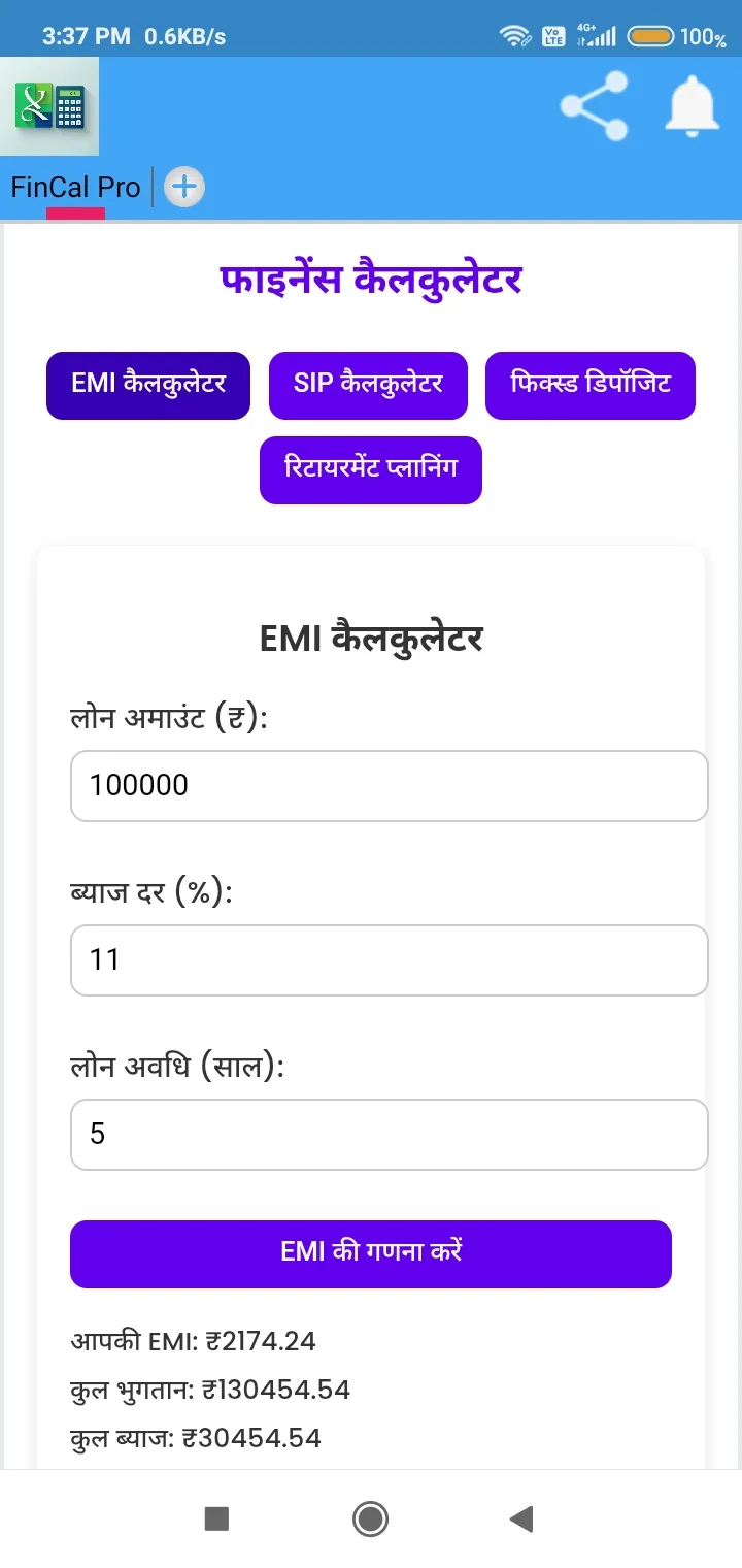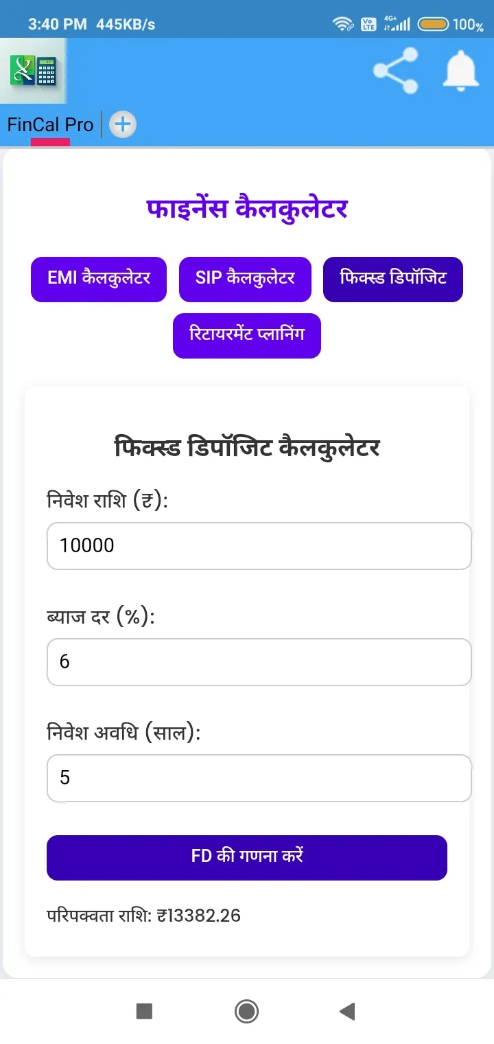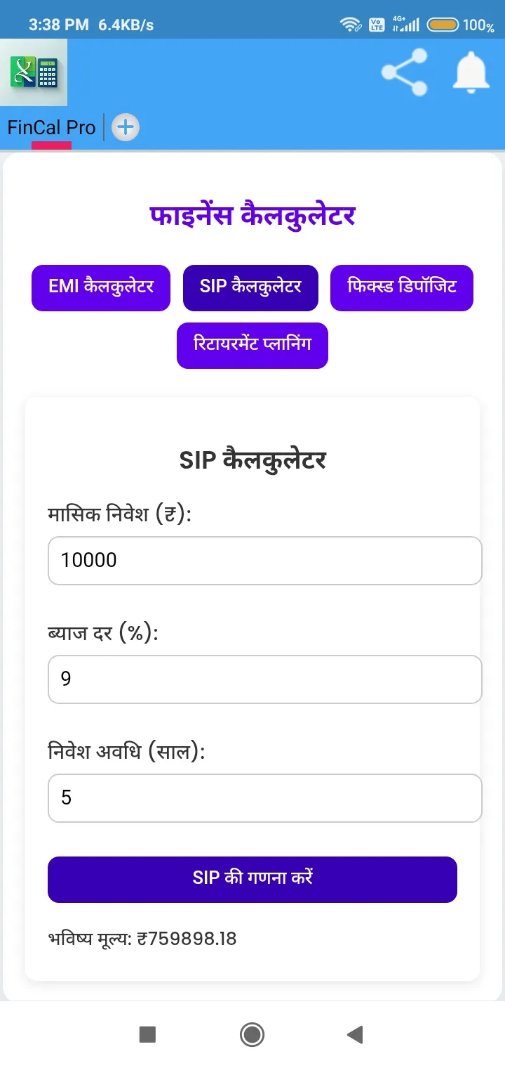 FinCal Pro - Your Smart Financial Calculator! π Features: β EMI Calculator β Calculate loan EMI, total payment, and total interest. β SIP Calculator β Find out the future value of your SIP investment. β Fixed Deposit Calculator β Calculate the maturity amount of your FD. β Retirement Planning β Estimate the required corpus for your retirement. π’ Simple, fast, and reliable β FinCal Pro makes financial planning effortless! π½ Download now and take control of your finances!