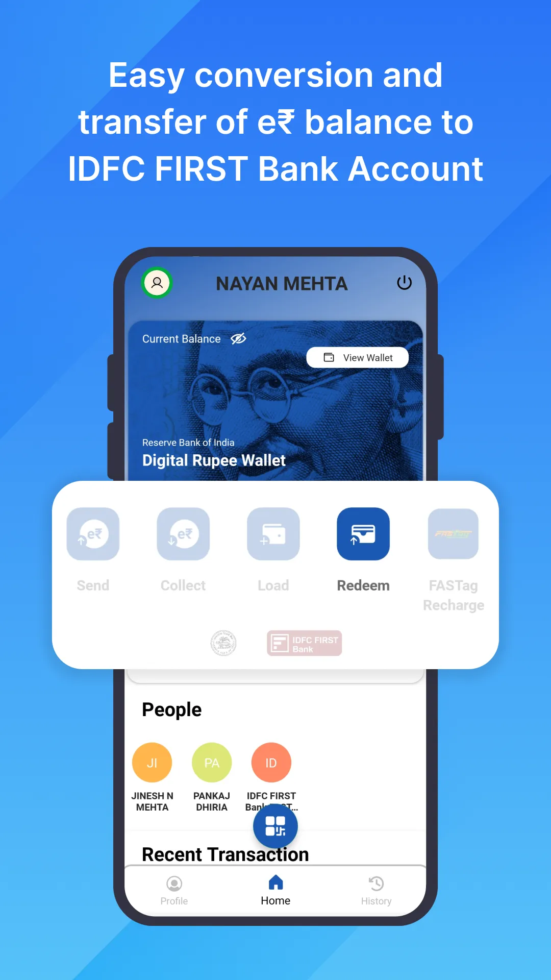 IDFC FIRST Bank Digital Rupee app is IDFC FIRST Bank's offering as a wallet for the Digital Rupee network launched by RBI to facilitate secure, faster, and digital currency transactions. You will be able to transact using Digital Rupee between merchants and other users registered on this network. Digital Rupee is an RBI initiative to create digital currency and complement the physical currency.