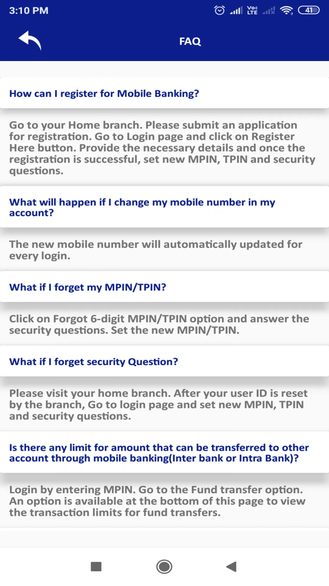 Following Facilities are available in the Mobile Application:- Banking Transactions-Account Details and Statement Fund Transfer-Own Account, Third Party Transfer within Bank Fund Transfer-Transfer to other Bank's Account-NEFT IMPS Transfer using Account number and IFSC, Mobile number. Cheque Operations