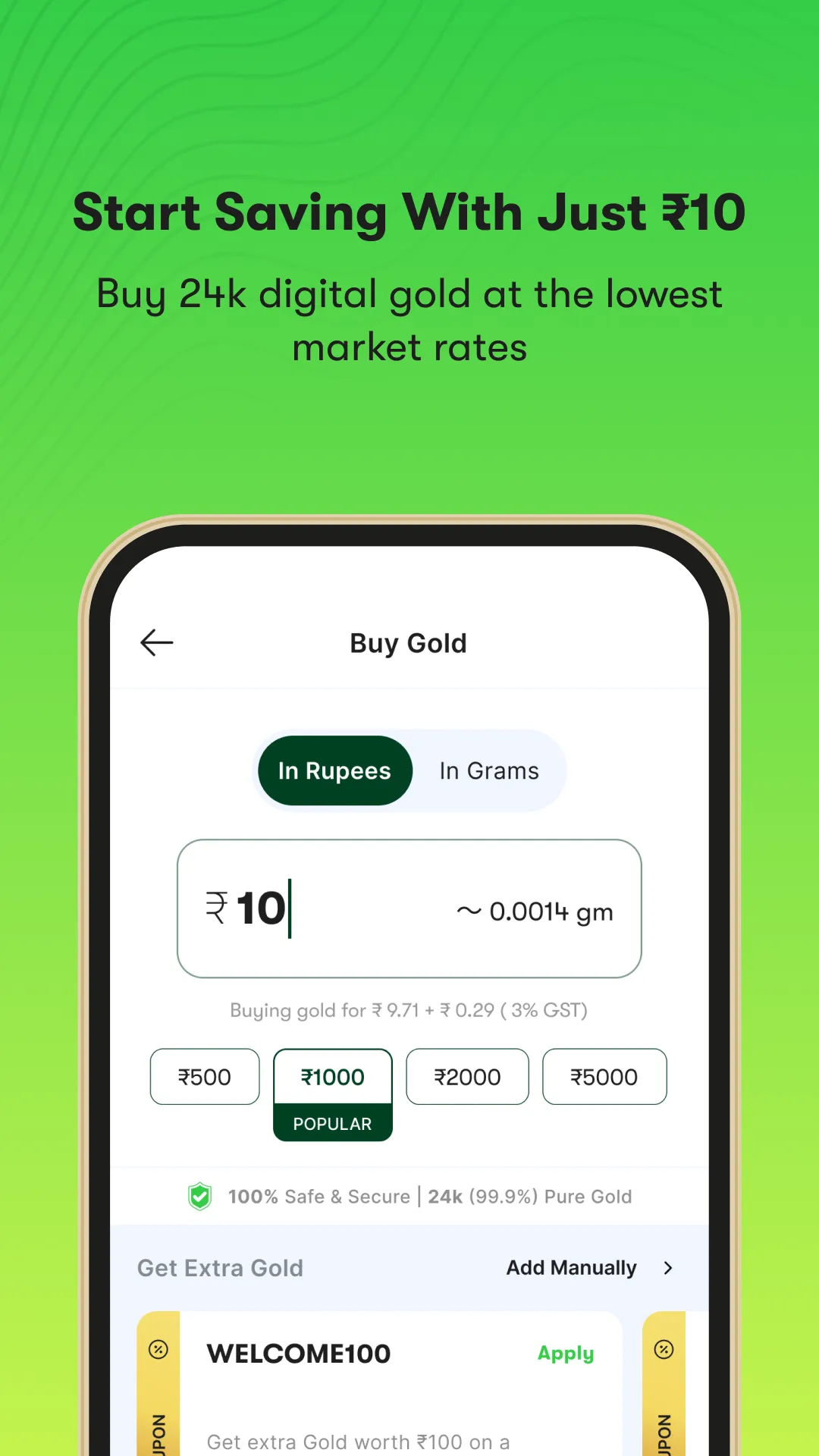 Kalash is a smart Digital Gold savings app in India that allows you to buy, sell, and invest in 24k digital gold, starting at just ₹10 per day! Get gold rewards every time you invest in 24k digital gold with Kalash. It is the most easy, accessible, and secured way of investing in gold and increasing your savings. Kalash is the only saving money app in India that not only allows you to invest in gold, but also rewards you with Bitcoin, the digital gold of the future. Earn up to 5% in Bitcoin rewards every time you buy gold on the app. Benefits of using Kalash - ...
