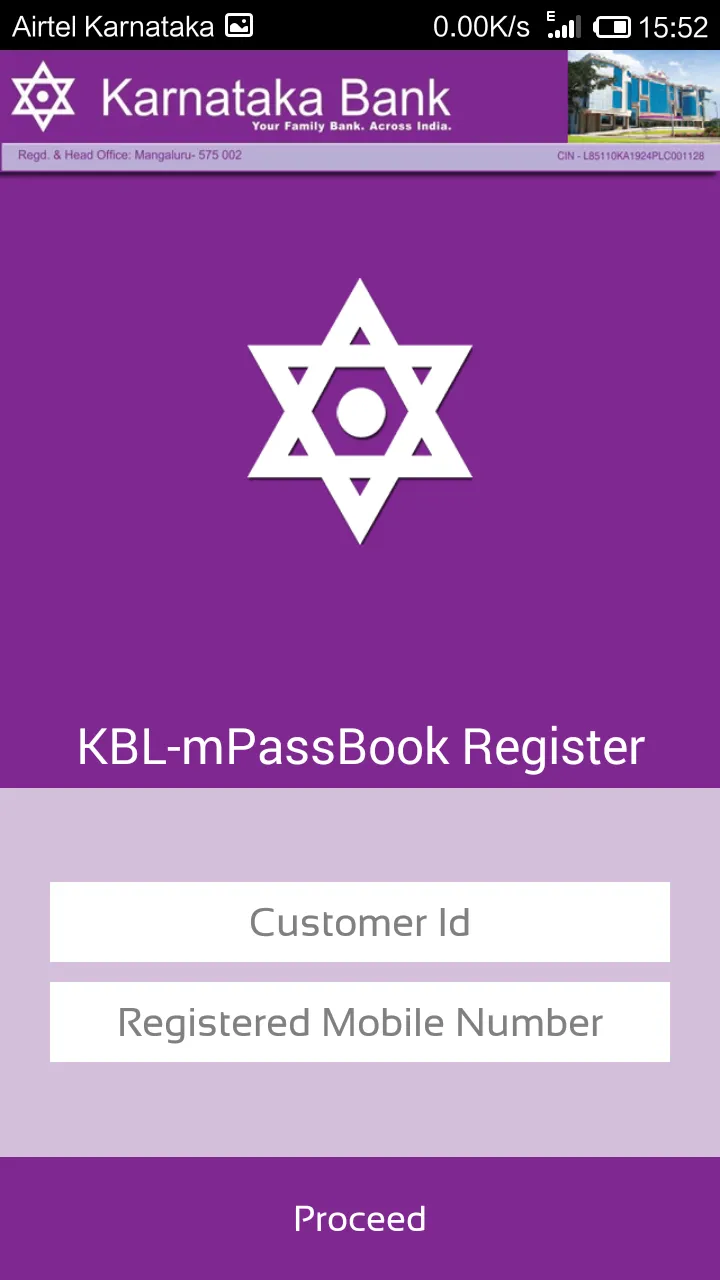 Karnataka Bank Offers New Generation Mobile PassBook service branded as "KBL mPassbook 1.0.4" to its Customers. Register by entering your i) 9 digit Customer Id which is available on 1st page of your physical Pass Book or by contacting your Base branch and ii) 10 digit Mobile number registered with the Bank.