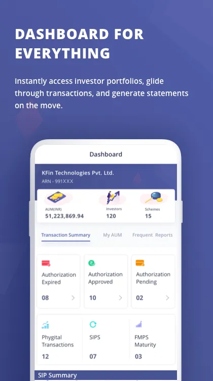 Now, become a smart financial distributor with KFintech’s KFinKart Distributor app. Access the universe of KFintech serviced mutual funds on your smart phone. No more running around with documents or getting stuck with lengthy processes while initiating mutual fund transactions for your customers. As a distributor and a financial distributor, KFinKart enables you to instantly fill customer details, bunch all the documents and invest with the ease and speed of a touch. This means, you can now initiate transactions, generate reports and seek statements on behalf of your customer right from where you are. Get more productive and effective in delivering quick and delightful services to your customers. KFinKart’s full service menu, intelligent features and intuitive navigation empowers you to achieve faster and earn more. You can also track each customer’s portfolio and send reminders on new fund offers, SIP, repurchase and redemption. And of course, all your earnings are pooled so you can instantly touch and view. Key Features...