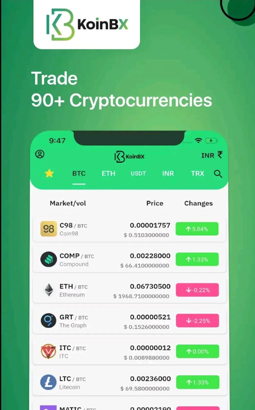 KoinBX: Most Trusted & Fastest Growing Crypto Exchange. We are FIU Registered & 100% Compliant With Indian Regulations. Join the 1.5+ million crypto community to safely trade cryptos on KoinBX. We are listed among the Top 100 Crypto Exchanges on CoinMarketCap. KoinBX believes in making crypto accessible to everyone in India. Begin your crypto journey with as little as INR 100. Explore 150+ active trading pairs and 120+ listed cryptos, including key cryptos such as Bitcoin (BTC), Ethereum (ETH), Ripple (XRP), Tron (TRX), Tether (USDT), and more. Enjoy instant INR deposit and withdrawal options with a seamless KYC process, 24/7 live open order books, high liquidity, low trading fees, and a rewarding referral program. Why KoinBX? ...