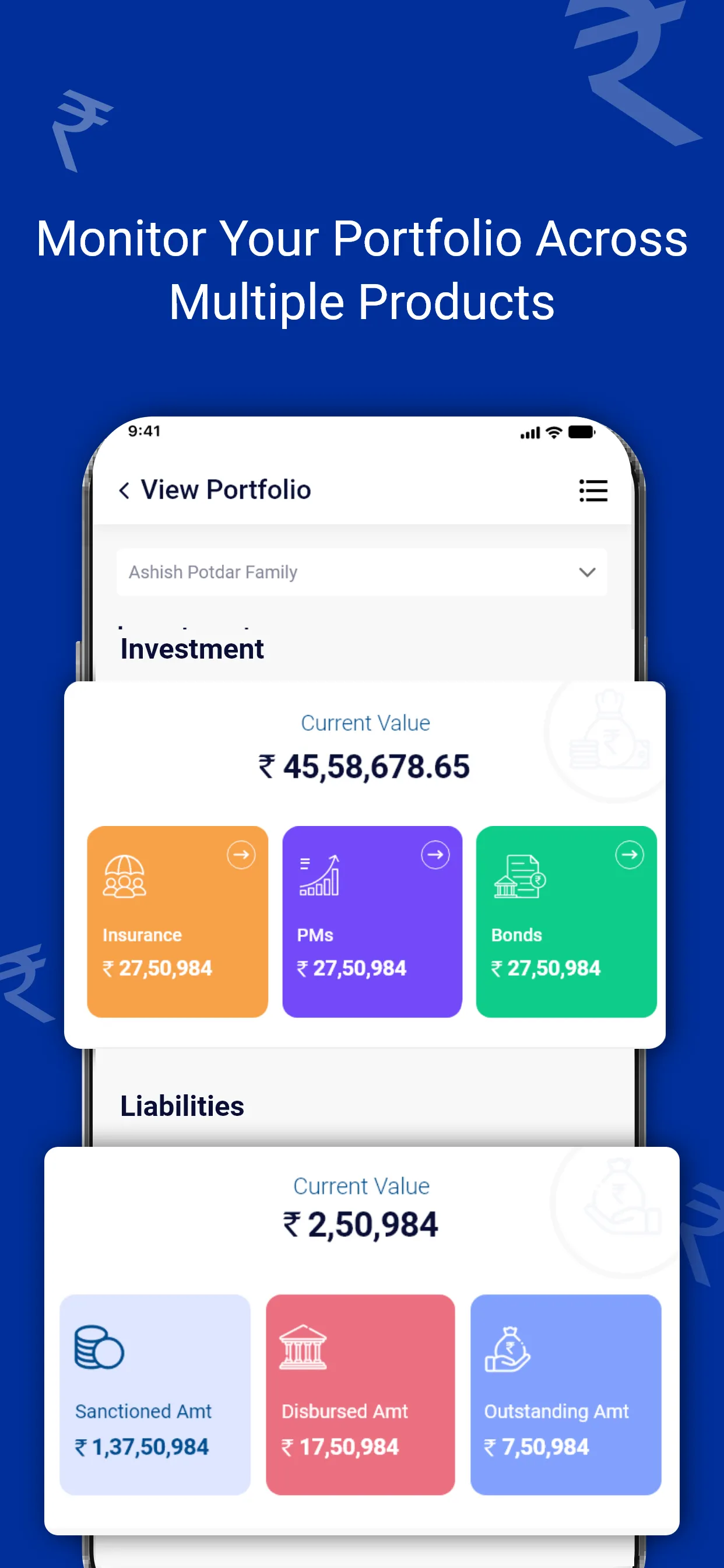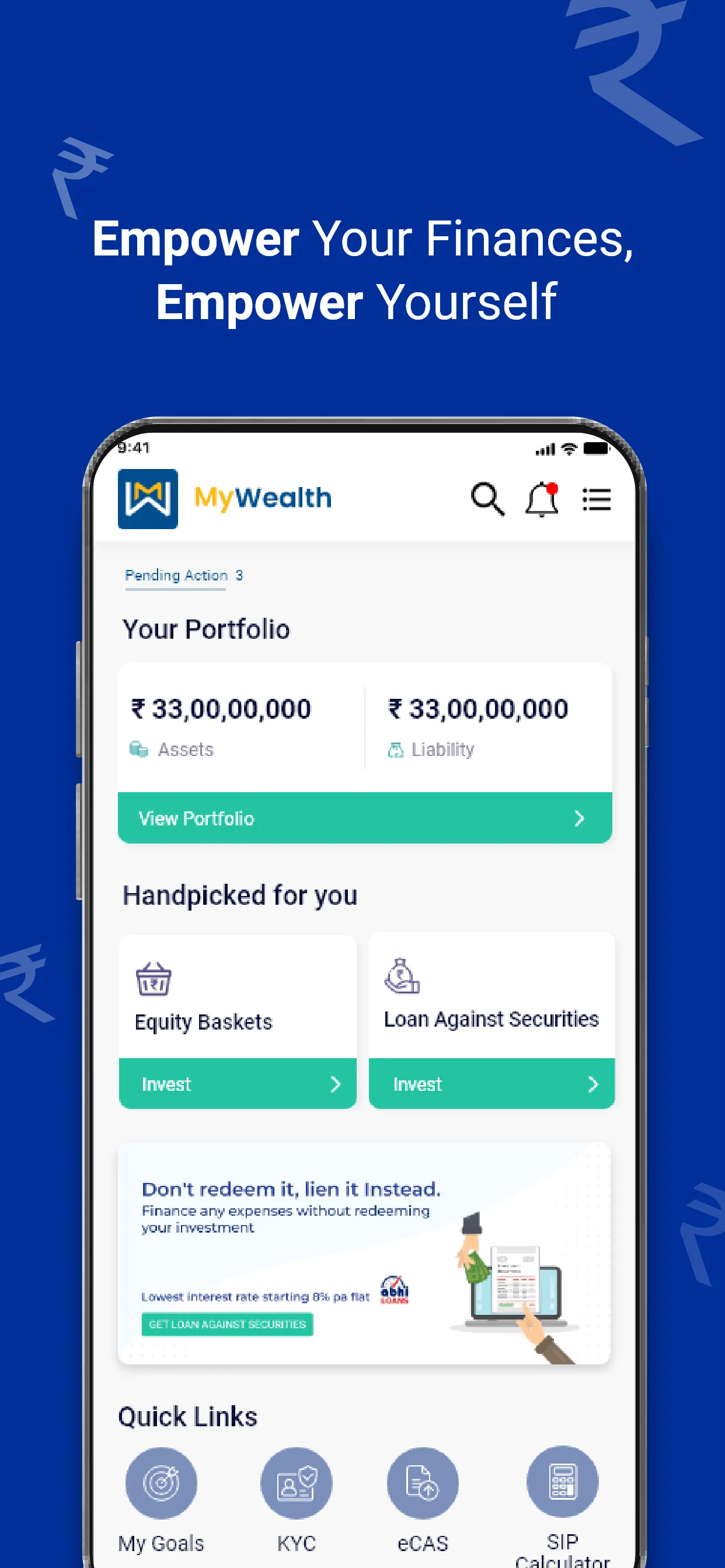 MyWealth is your all-in-one investment app, designed to empower your financial journey. With its modern interface, comprehensive portfolio management, and seamless online execution, MyWealth brings the best investment solutions right to your fingertips. Key Features: • Seamlessly transact and execute investments that match your goals. Invest in mutual funds, equity baskets, p2p investments, and more with ease. • Comprehensive portfolio view to access all investments and liabilities in one place, including those of family members. • Track and monitor investments across stocks, bonds, FDs, PMS, and more by simply uploading your eCAS statement....