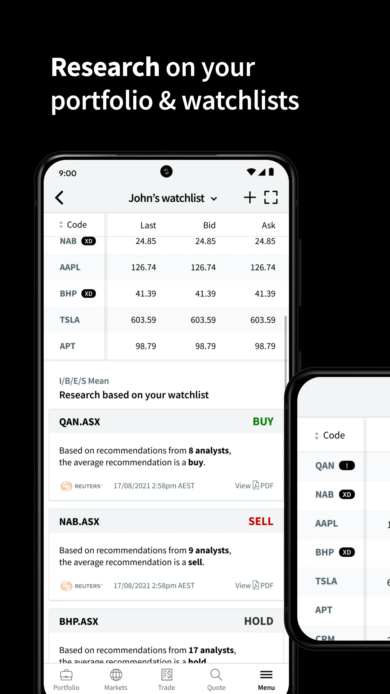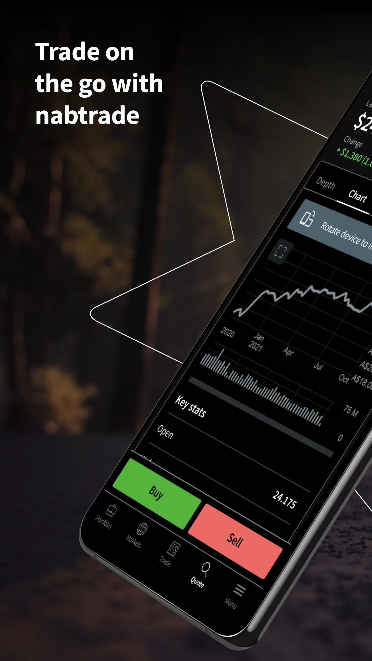 The new nabtrade app - everything you need to manage money on the go. With the nabtrade app you can : • See all your nabtrade accounts • Trade across all supported markets • View company information and research with live pricing • Manage NAB internet banking and nabtrade cash accounts with Pay Anyone • Set and view company alerts on your portfolio • View and manage your watchlist • Use PIN to login and trade