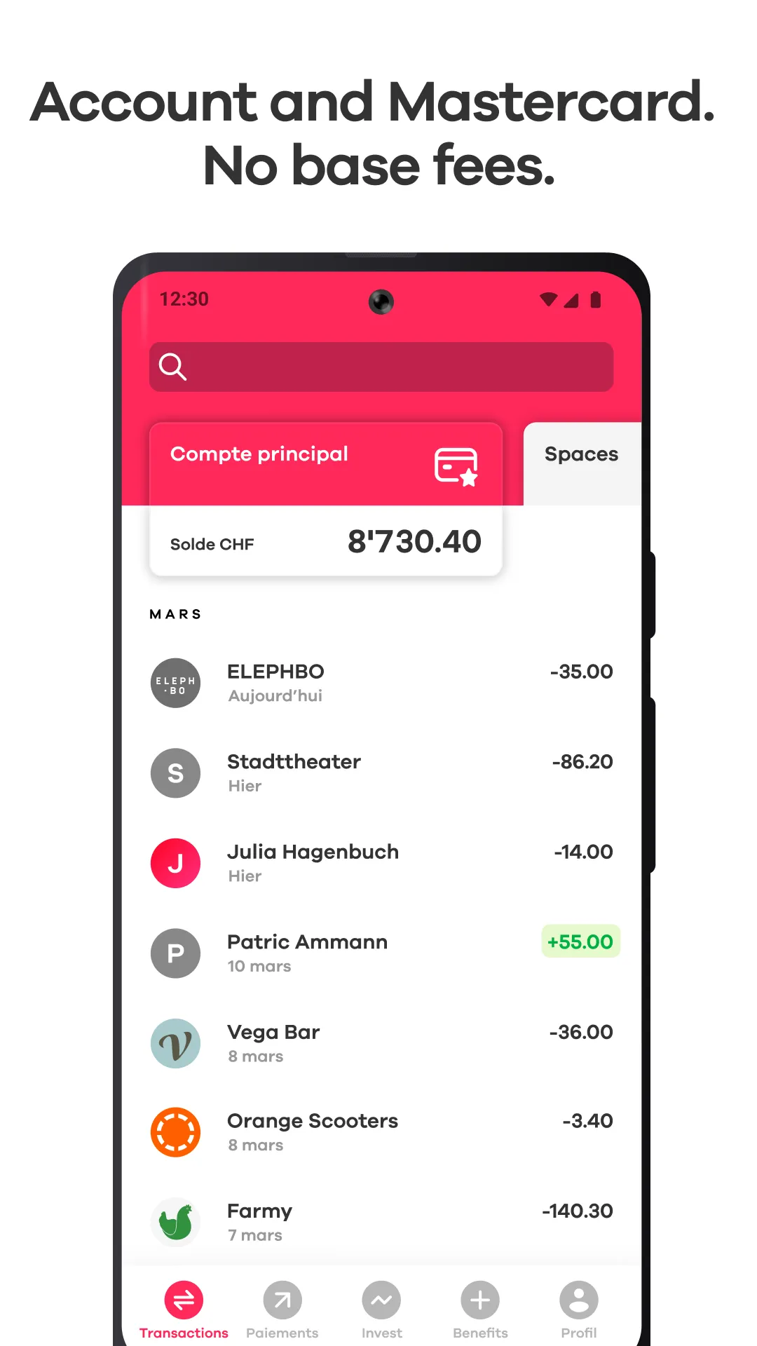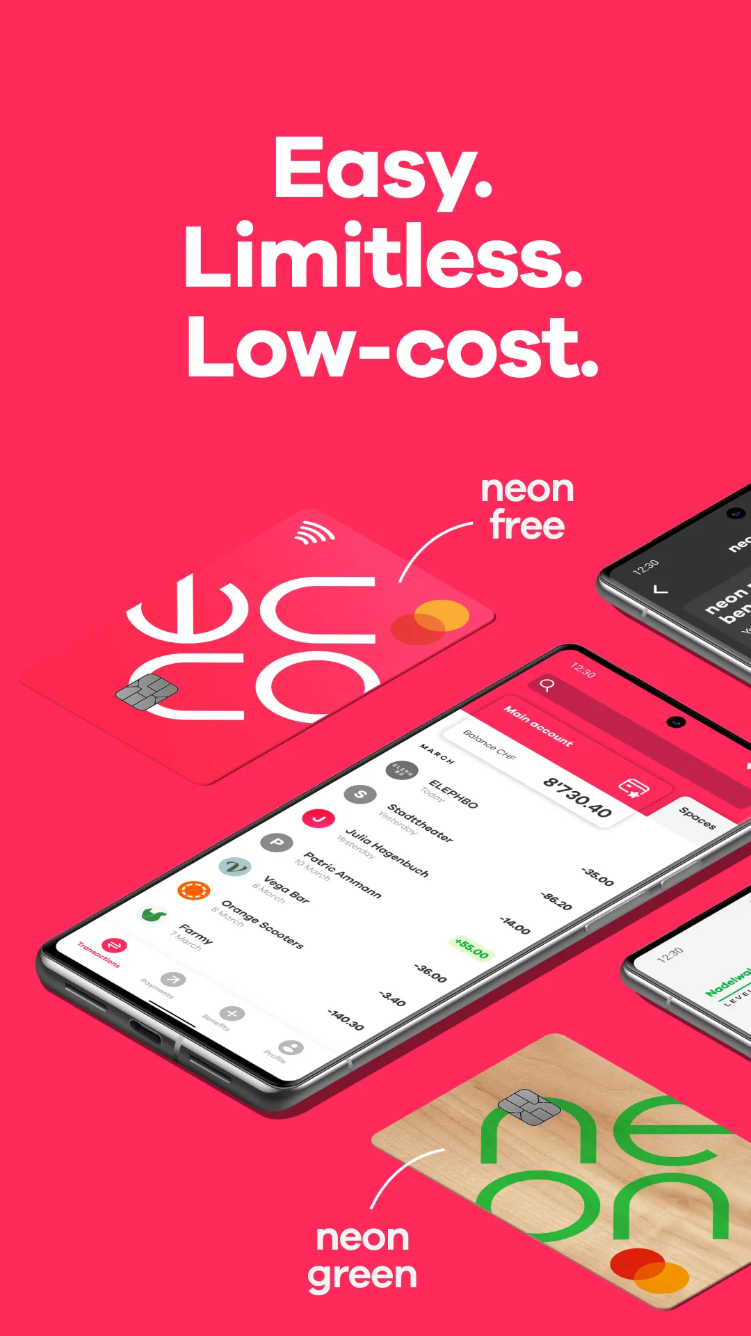With neon you have your account on your smartphone. Always at your fingertips. Transferring money has never been easier. You always have an overview of your income and expenses. And with the neon Mastercard®, you can pay worldwide and online without fees and exchange rate surcharges. ATTENTION: To use neon, you must have your primary residential address and tax liability in Switzerland and be at least 15 years old. You also need either a Swiss passport/ID or a B or C residence permit. You can choose from 3 accounts: • neon free: the everyday account with zero base fees...