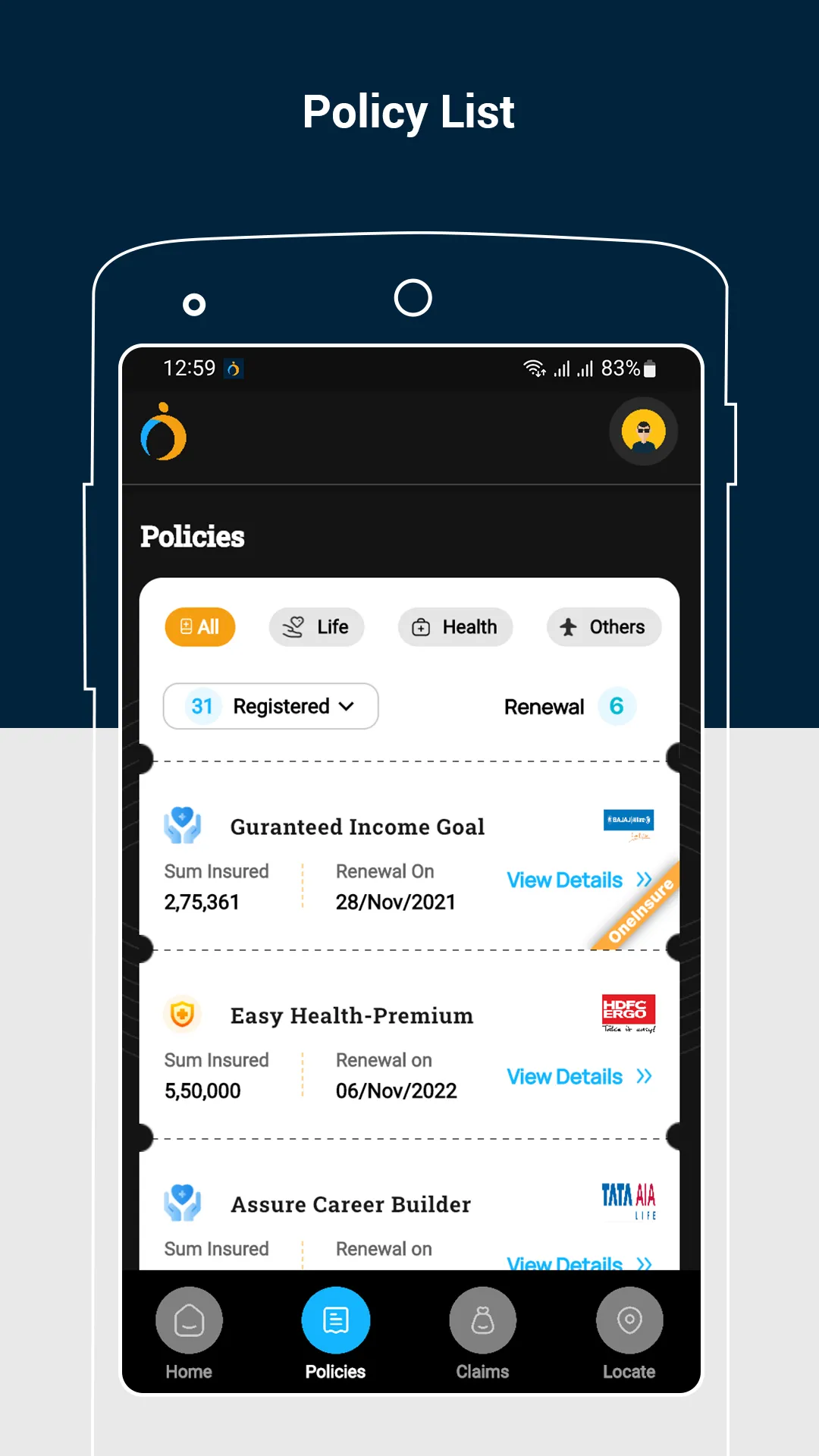 The OneInsure App – Your One-stop Insurance Destination WHY USE ONEINSURE APP: • Digital Storage : No more running around. Manage all your policies from one place. • Service : Get service and support for the entire lifetime of your policy. • Claim Assistance : Complete guidance and assistance from a team of claim experts. • Renewal Reminders & Payments : Timely reminders so that you never miss your payments....