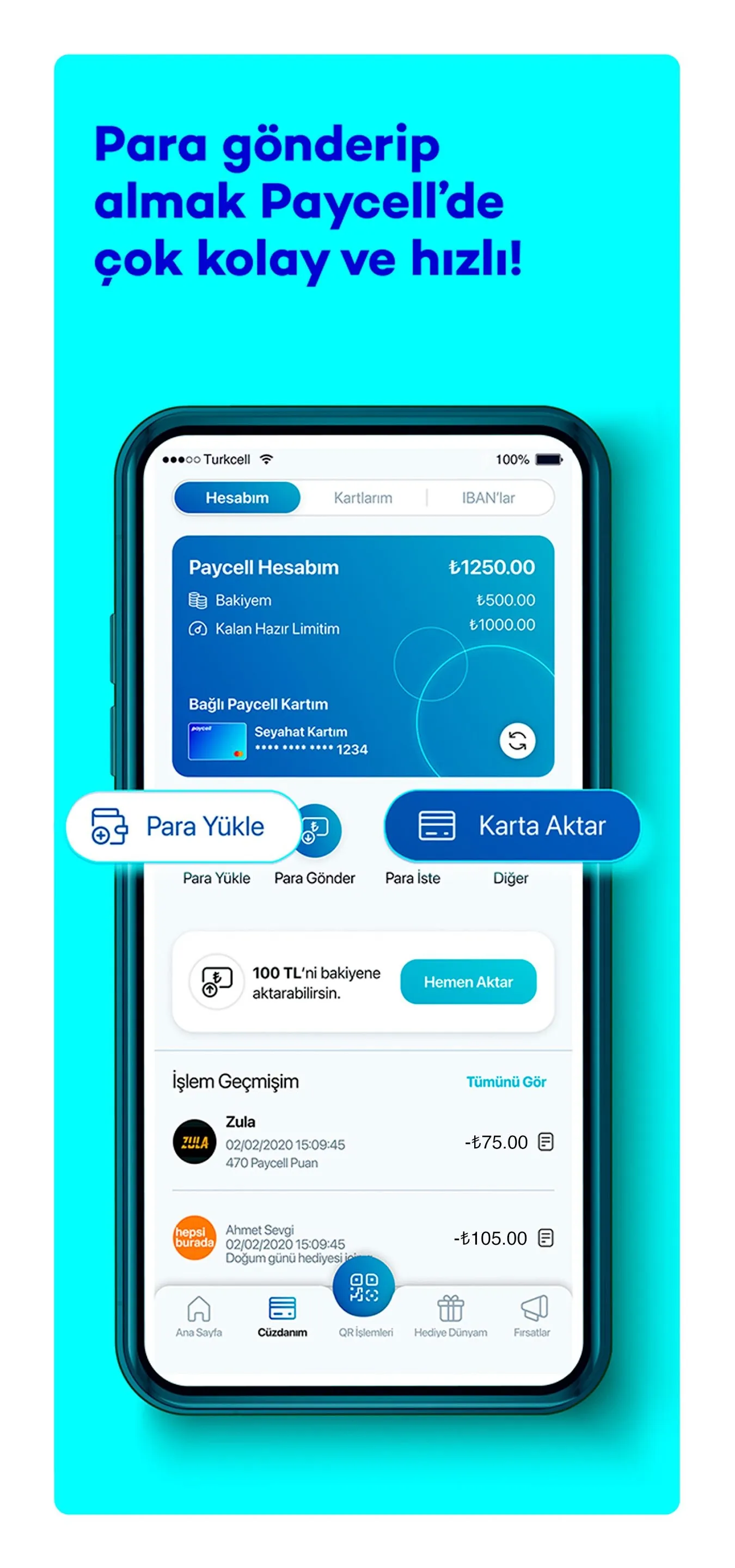 Let us introduce you to the payment technology that makes your shopping experiences even more advantageous: Paycell. Discover Paycell's opportunities now! Pay Everywhere with Paycell Paycell is always there for you to make your payments quickly and securely on a single platform. Once you register with your phone number, you can have a contract-free Paycell Card. Then, it’s time to transfer or request money, top-up Turkcell TL or Istanbul Card wherever you want! ...