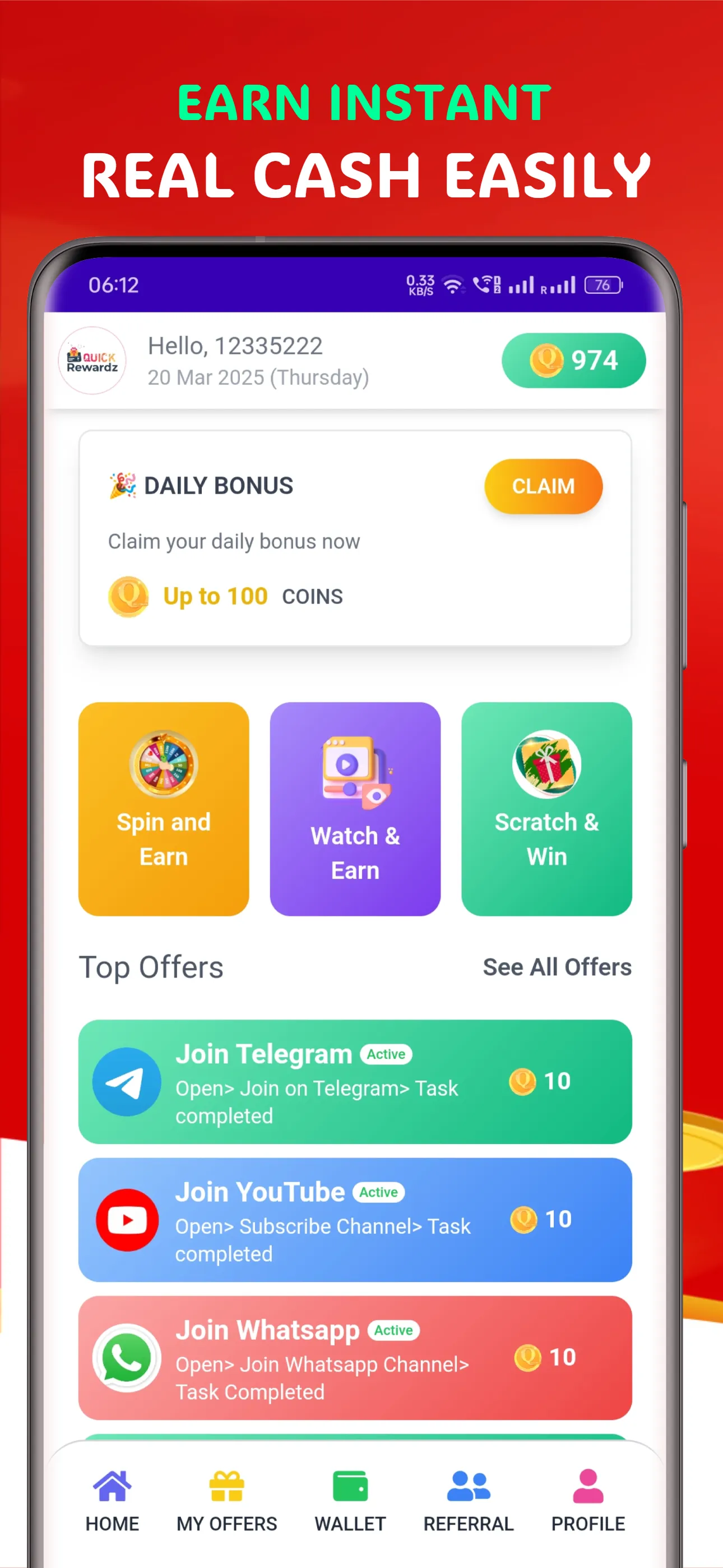 QuickRewardz – Earn Rewards & Redeem Exciting Prizes! QuickRewardz is a fun and rewarding platform where you can complete simple tasks, watch content, play games, and explore offers to collect points and redeem exciting prizes. Engage with interactive activities and enjoy multiple ways to earn rewards effortlessly. 🌟 Key Features: ✔ Watch & Earn – Earn points by watching engaging content. ✔ Task & Offers – Explore new websites and offers for extra rewards....