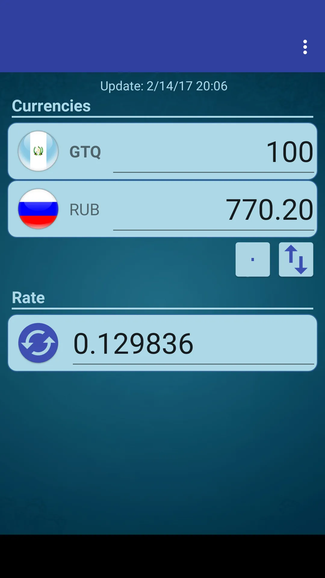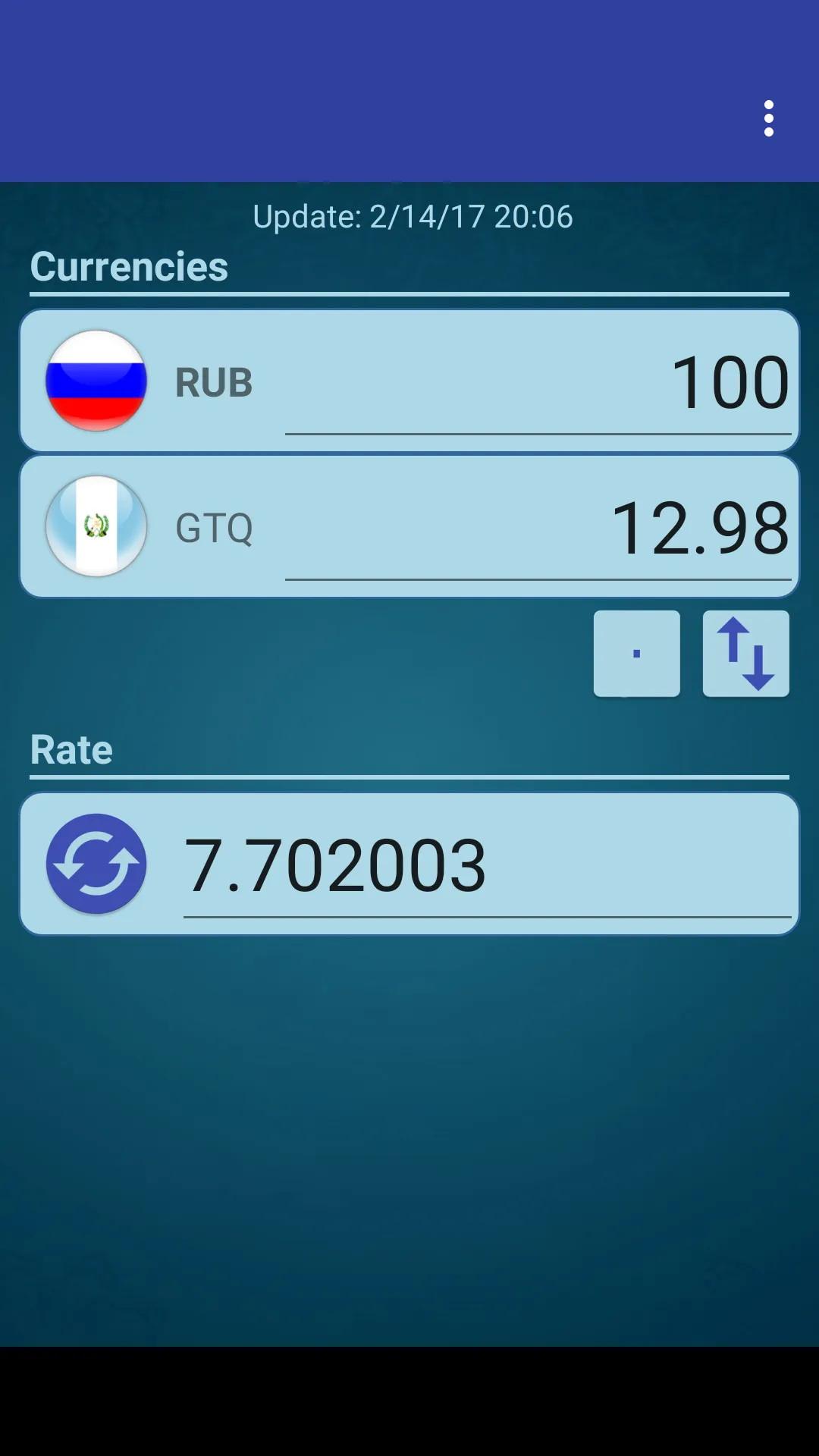A simple currency converter from Russian Ruble to Guatemalan Quetzal and from Guatemalan Quetzal to Russian Ruble. This application includes the following features: - Currency converter - Exchange rate online - Allows you to change the rate manually to the rate of your choice Russian Ruble x Guatemalan Quetzal (RUB GTQ) Guatemalan Quetzal x Russian Ruble (GTQ RUB)