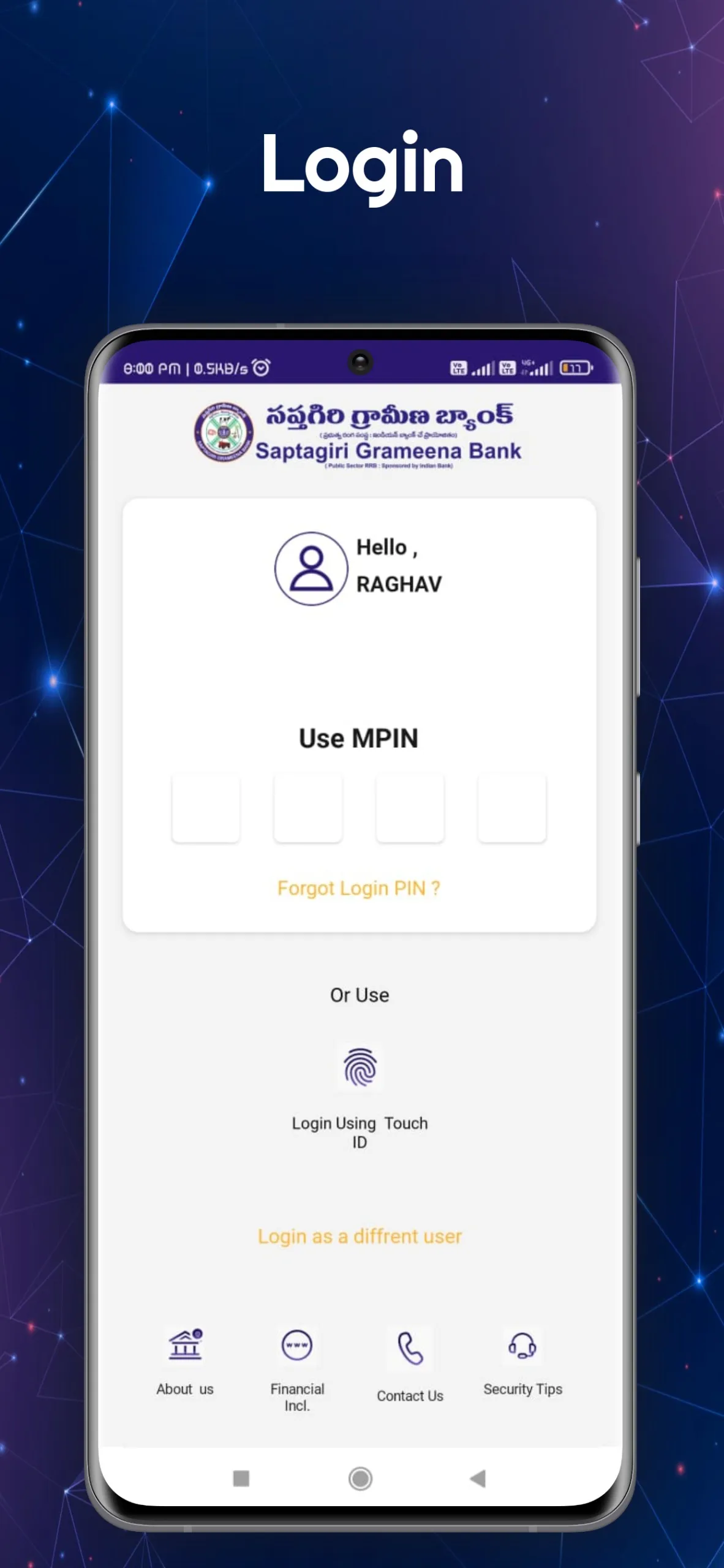 Mobile Banking application for Smart Phone customers of Saptagiri Grameena Bank. A safe, convenient and easy to use application with a host of features to help users manage your finances on the move. Download the application from Google Play store Only. Do not use any other websites for downloading this application. My Accounts • Detailed account information (Savings / Current / Deposit / Loan) • Mini Statement • Account Statement • Intra Bank Funds transfer