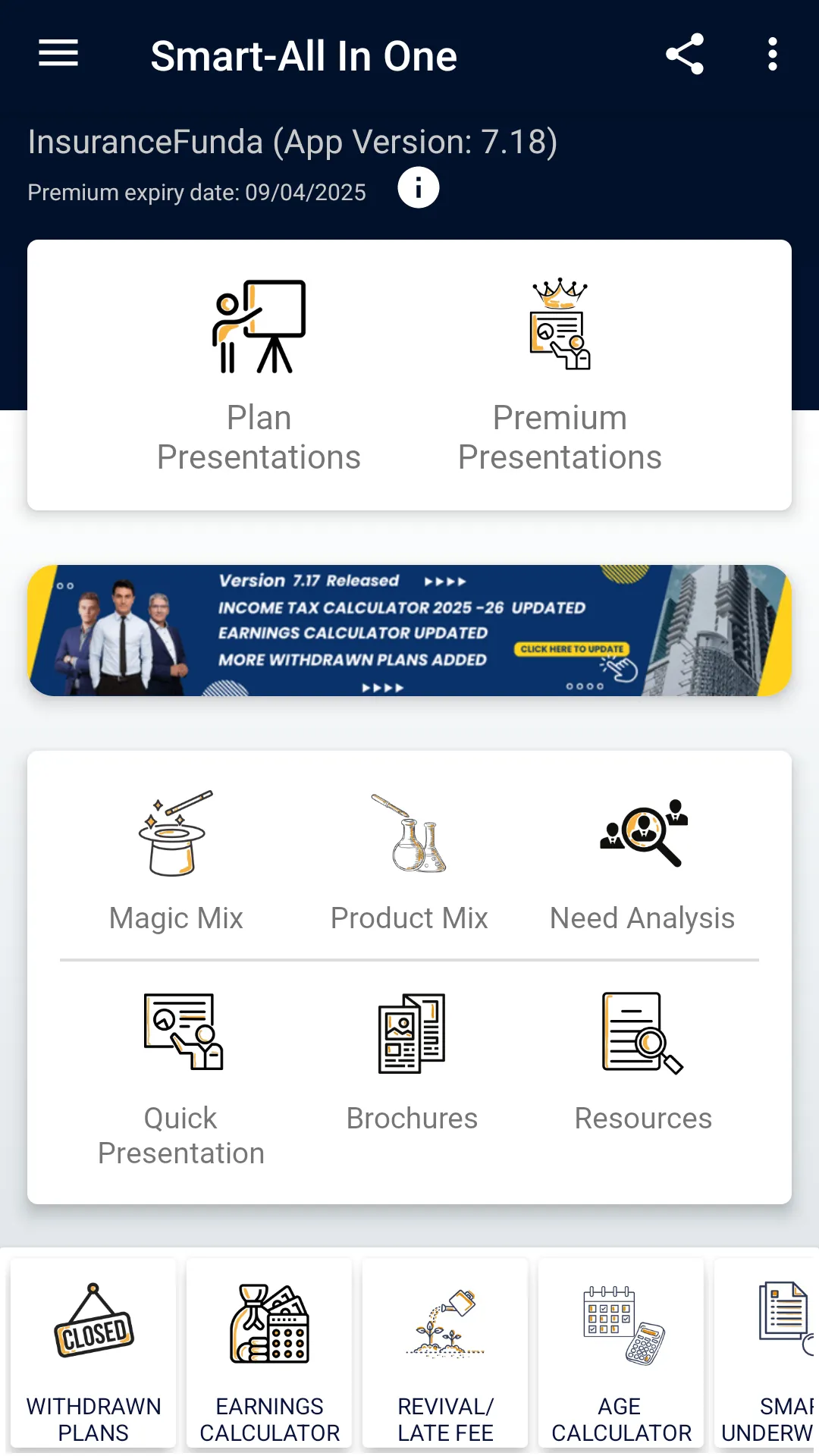 Smart - All In One Calculator is an insurance premium and benefits information calculator app. Disclaimer: This application (Smart-All In One Calculator) is not affiliated with, endorsed by, or representative of any government entity including Life Insurance Corporation of India(LIC). It is important to note that this application does not represent the Life Insurance Corporation of India (LIC). This app is intended to be used as training material for agents and development officers of LIC to get a general idea of the premiums and benefits of the insurance plans....