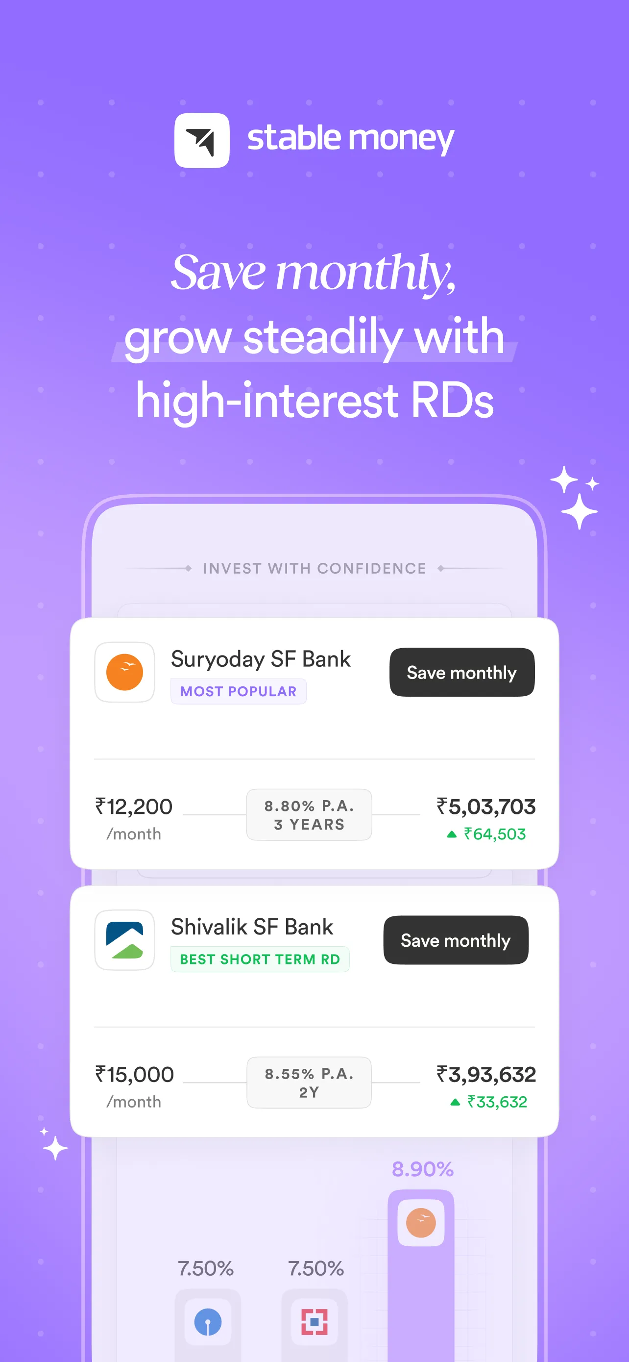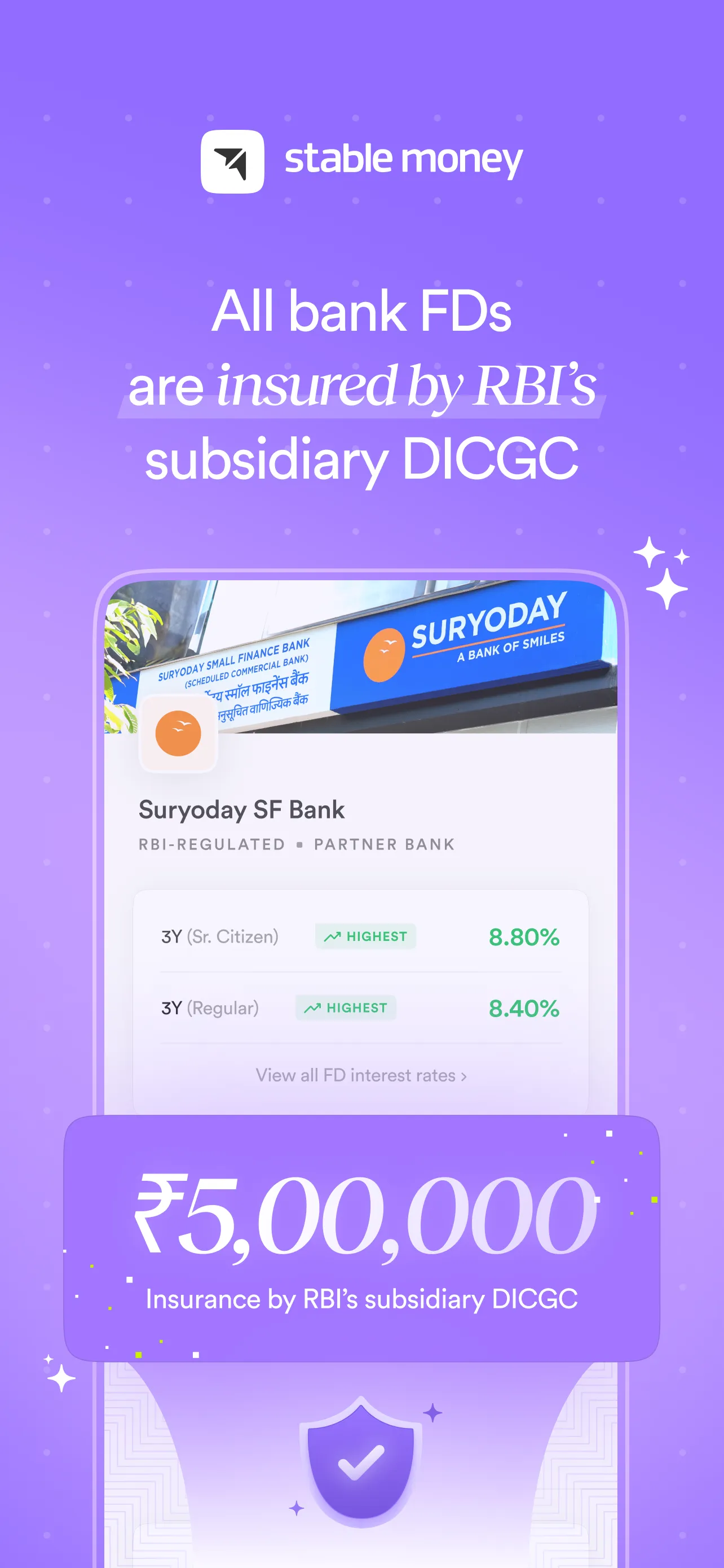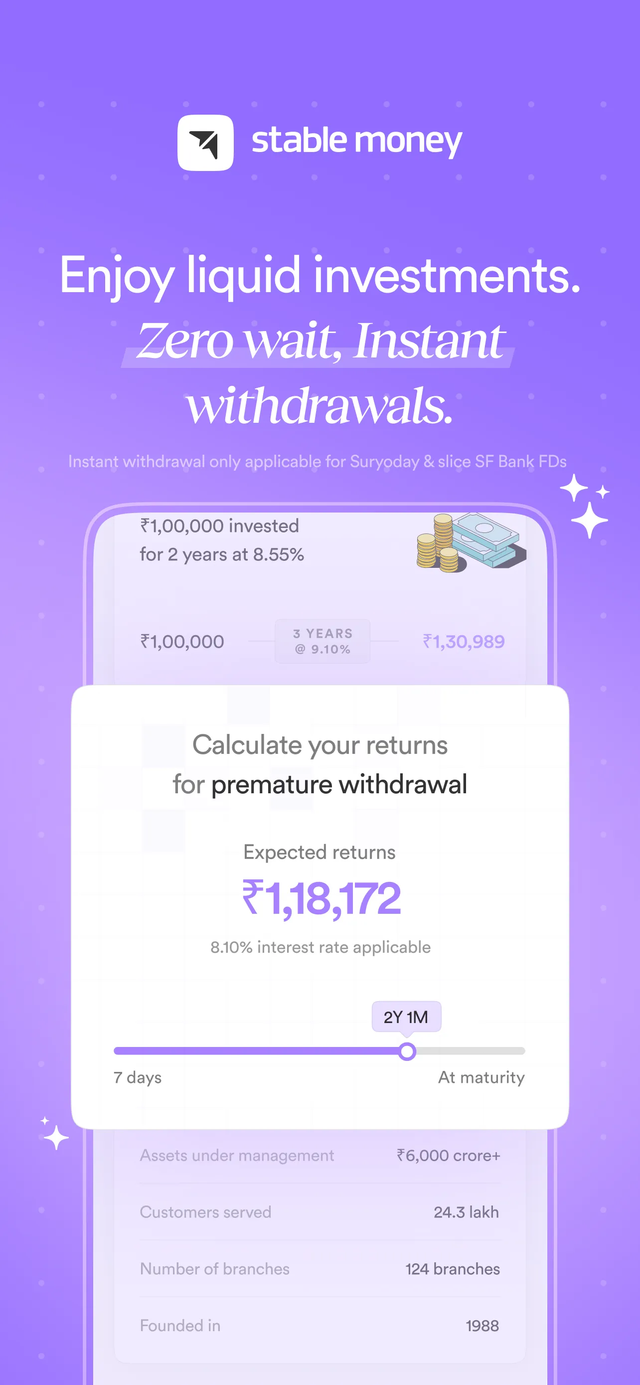 We are excited to introduce the all-new Stable Money fixed deposit App, India’s fixed deposit booking platform that requires no new bank account. Now, you can invest in fixed deposits online in under 3 minutes with a completely paperless process and without any hassle. Moreover, you can compare the interest rates of multiple FDs using the Stable Money App and get suggestions based on your investment goals. Stable Money is here to simplify your investment journey and sustain the best returns over a longer period. Features of Stable Money...