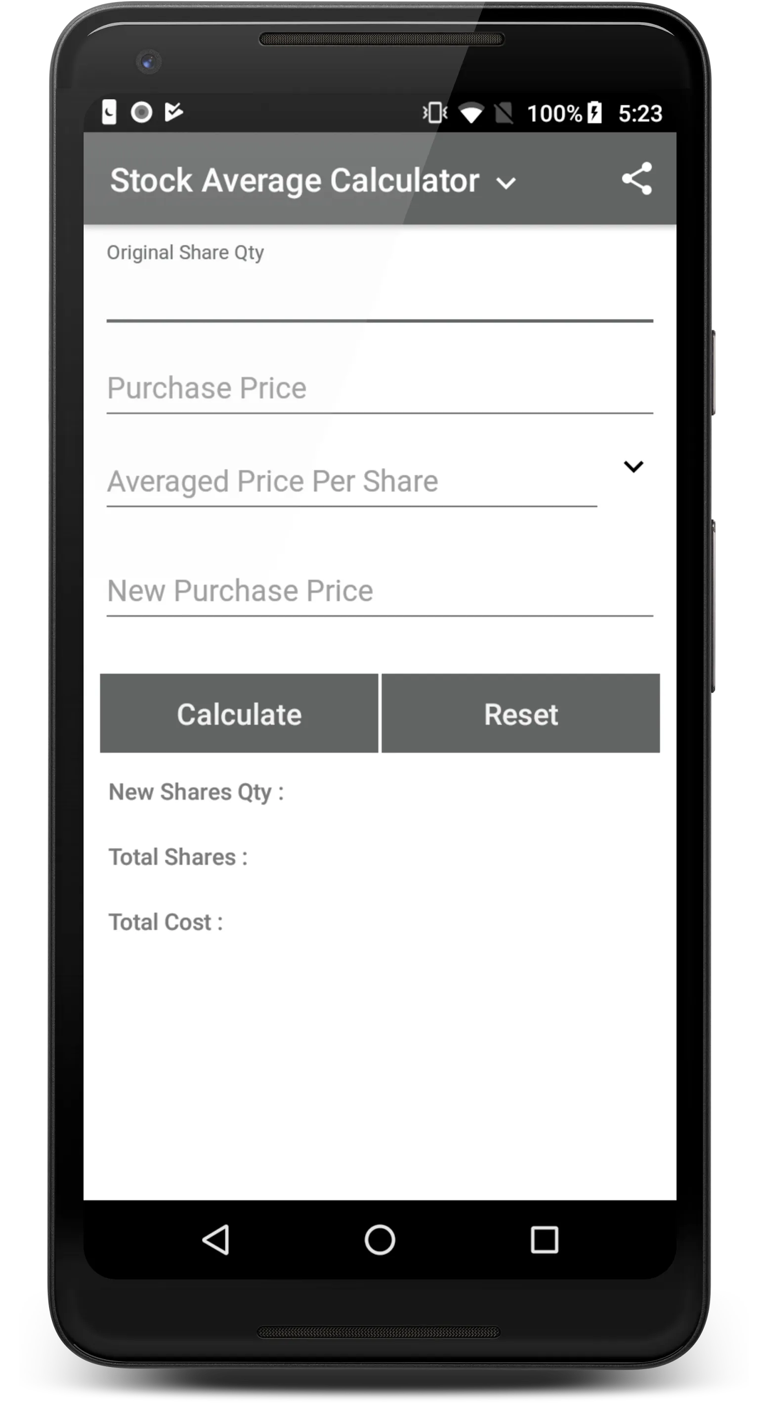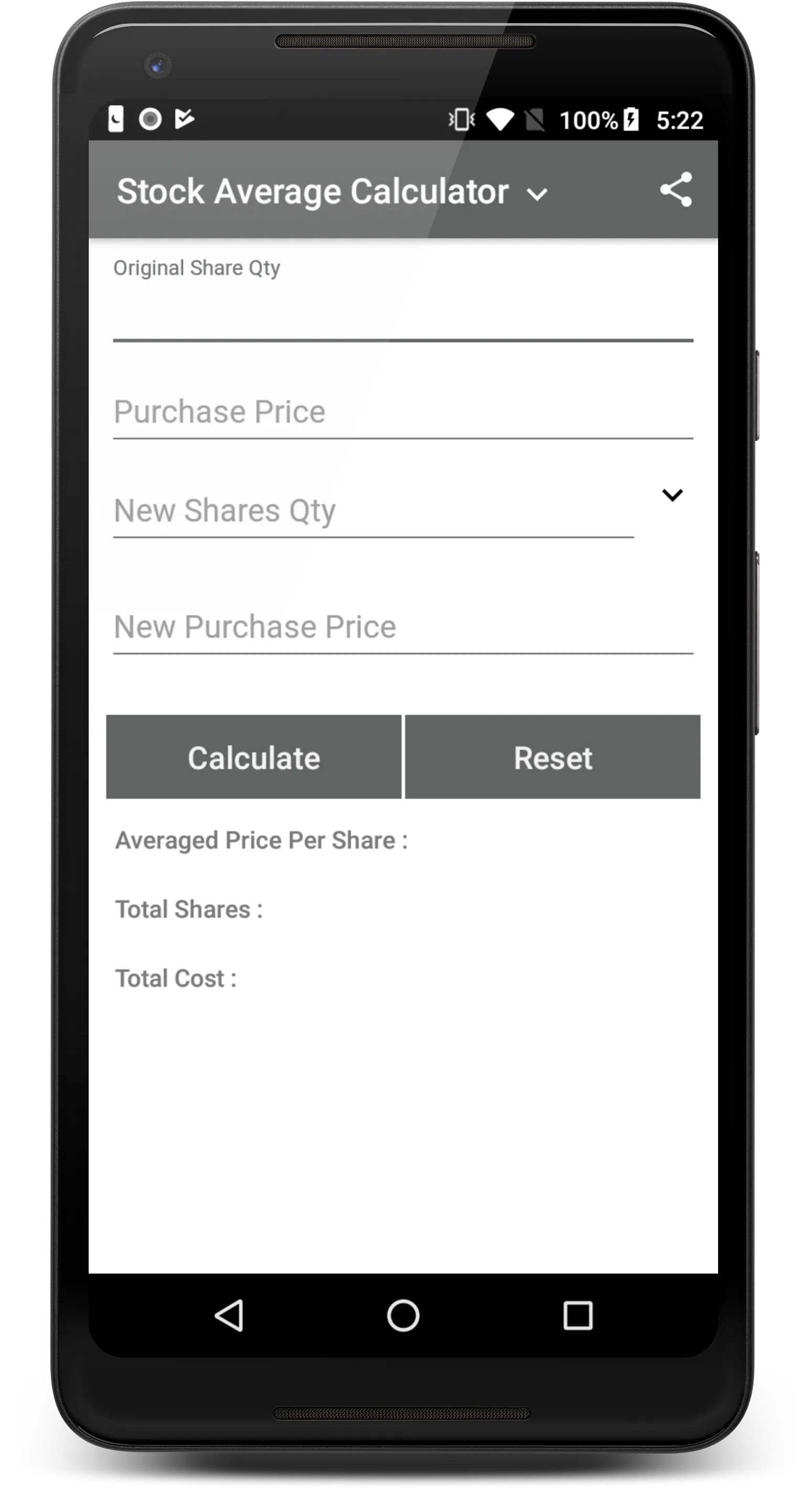 The Stock Average calculator calculates the average price of your stock when you purchase the same stock multiple times. We calculate a fraction shares in the stock average calculator. When we calculate the target average price per share that time uses an average price per share calculator. Example:- Suppose I have 100 shares of Xyz company price 100 after some time price down 80 and I want to average it to 90 prices so the app will give the new share buy quantity. Stock profit calculator calculates your total profit or loss on a particular stock that you buy and sell....