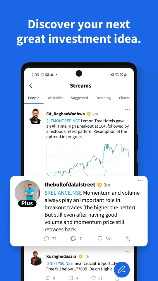 Download Stocktwits and tap into the heart of the markets with millions of other investors and traders. Get instant access to professional analysis, market sentiment, trending stocks, trading ideas, new market trends and more. Indian stocks & indices are now live on Stocktwits! See what everyone is saying about your favourite stocks and track the latest news and insights. FEATURES: ...