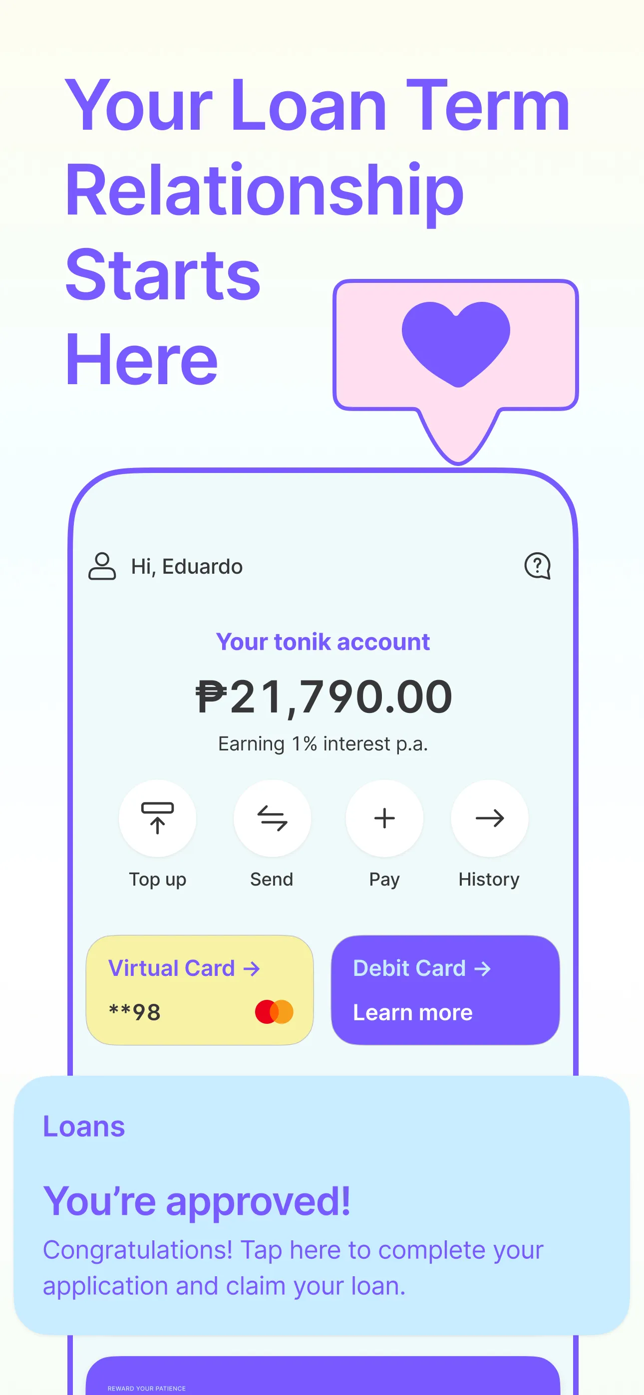Tonik is the Philippines' first neobank, proudly holding a digital bank license from the Bangko Sentral ng Pilipinas. At Tonik, we offer high-interest savings, round-the-clock customer care, and innovative services crafted to streamline your credit-building journey. Innovative. Passionate. Customer-first. That's Tonik. We're a 100% digital bank on a mission to revolutionize the way money works in Southeast Asia, offering only fast, easy, and secure transactions with a team of experienced bankers taking care of all your financial needs. We're a neobank that's there for you 24/7 with services that'll help you get ahead of your financial goals – that includes the Tonik Credit Builder! ...