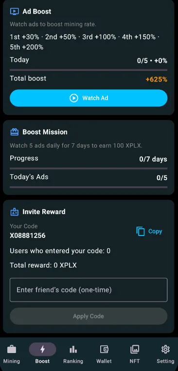 XPLORALX is a cloud mining simulator that rewards users with XPLX tokens. Start mining with just one tap and accumulate rewards every 24 hours. Boost your earnings by watching ads, inviting friends, and building a team. 💎 Features: • Auto cloud mining with 24-hour mining cycles ...