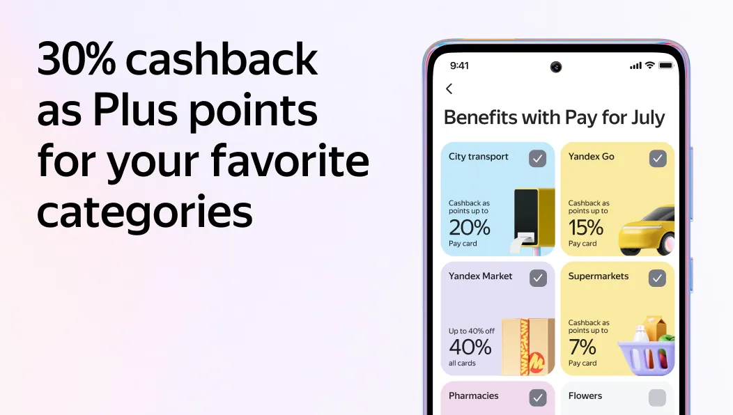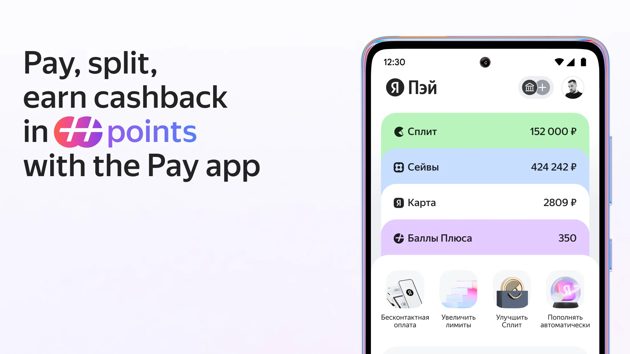 Pay anywhere, split payments, earn cashback in Plus points — now all in one Yandex Pay app. It’s advantageous and secure to shop with Pay. For example, in online stores with the Pay button: using any card and earning 1% cashback in points — in addition to what your bank offers. You can also pay offline: with SBP QR code or by your phone with NFC — earning 3% cashback in points. To earn even more Plus points, open a free Pay debit card. Choose 3 categories of increased cashback every month and get up to 10% in Yandex services, online stores and offline. And to unlock additional bonuses, keep money in the account. ...