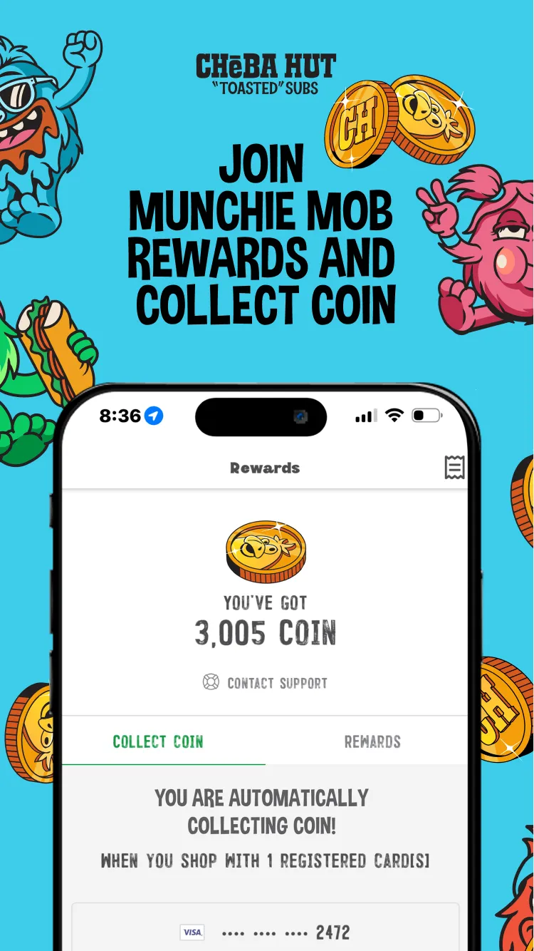 The Cheba Hut mobile app is absolutely lit! It's the fastest way to order your favorite "Toasted" subs and join Munchie Mob Rewards to score some Coin from our almighty mascot, Flip The Bird. App Features Include: 1. EXCLUSIVE REWARDS & OFFERS: Unlock exclusive rewards and offers from The Munchies that are only available through our app. 2. MOBILE ORDERING & PAYMENT: Order your favorite "Toasted" subs and munchies with just a few taps for take-out or delivery with Apple Pay or Google Pay....