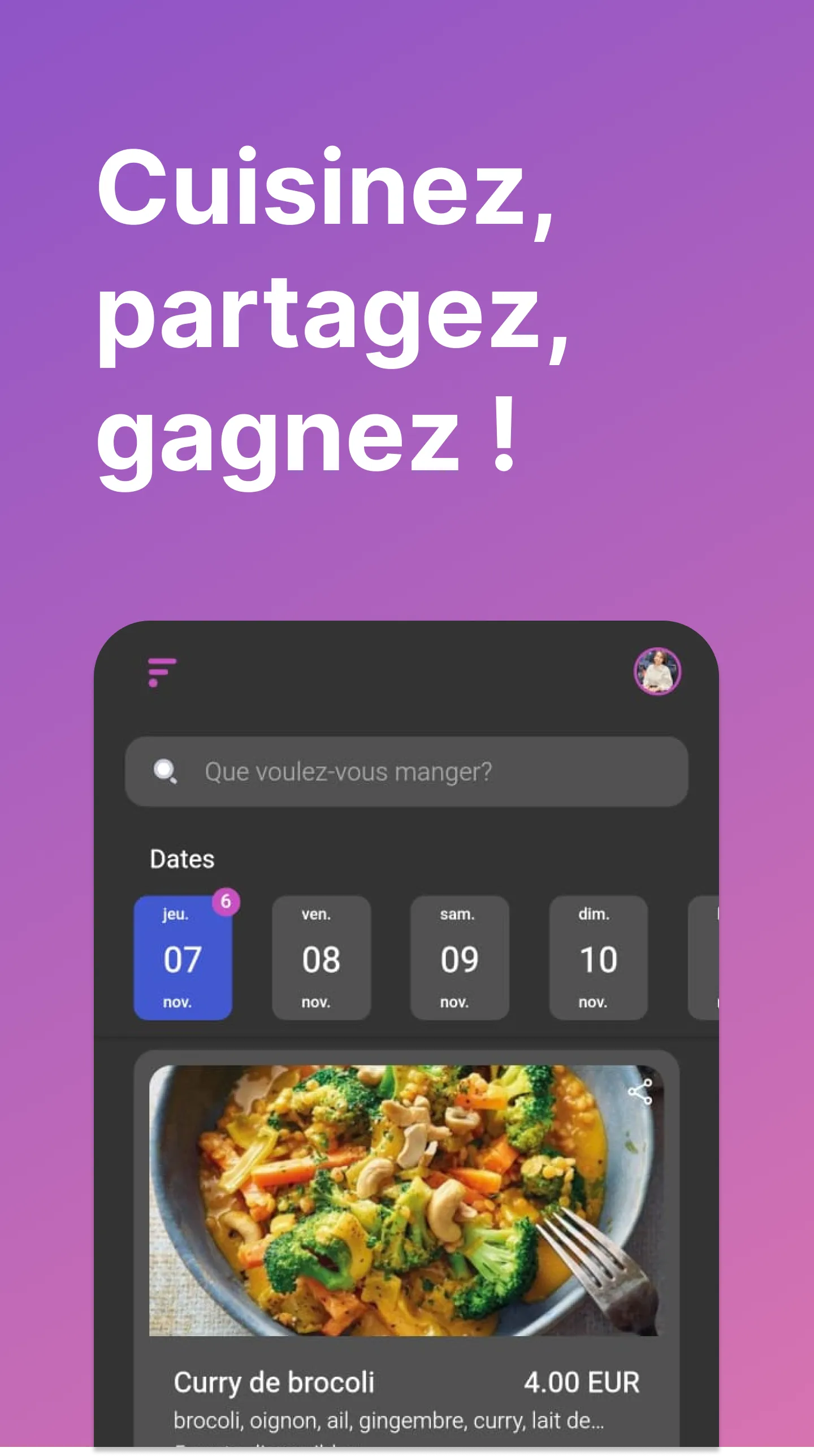 Discover Cook Forever, the app that revolutionizes the way you cook, share, and enjoy home cooking. In a world where every gesture to reduce food waste counts and where conviviality around a home-cooked meal takes on its full meaning, Cook Forever arrives as an innovative and supportive solution. With Cook Forever, immerse yourself in a world where: Every dish has its place: Whether you're a passionate home cook or simply someone who wants to share a surplus of meals, Cook Forever offers you the ideal platform. Easily post photos of your dishes, describe them and set a price. In just a few clicks, your culinary creations are ready to be discovered. ...