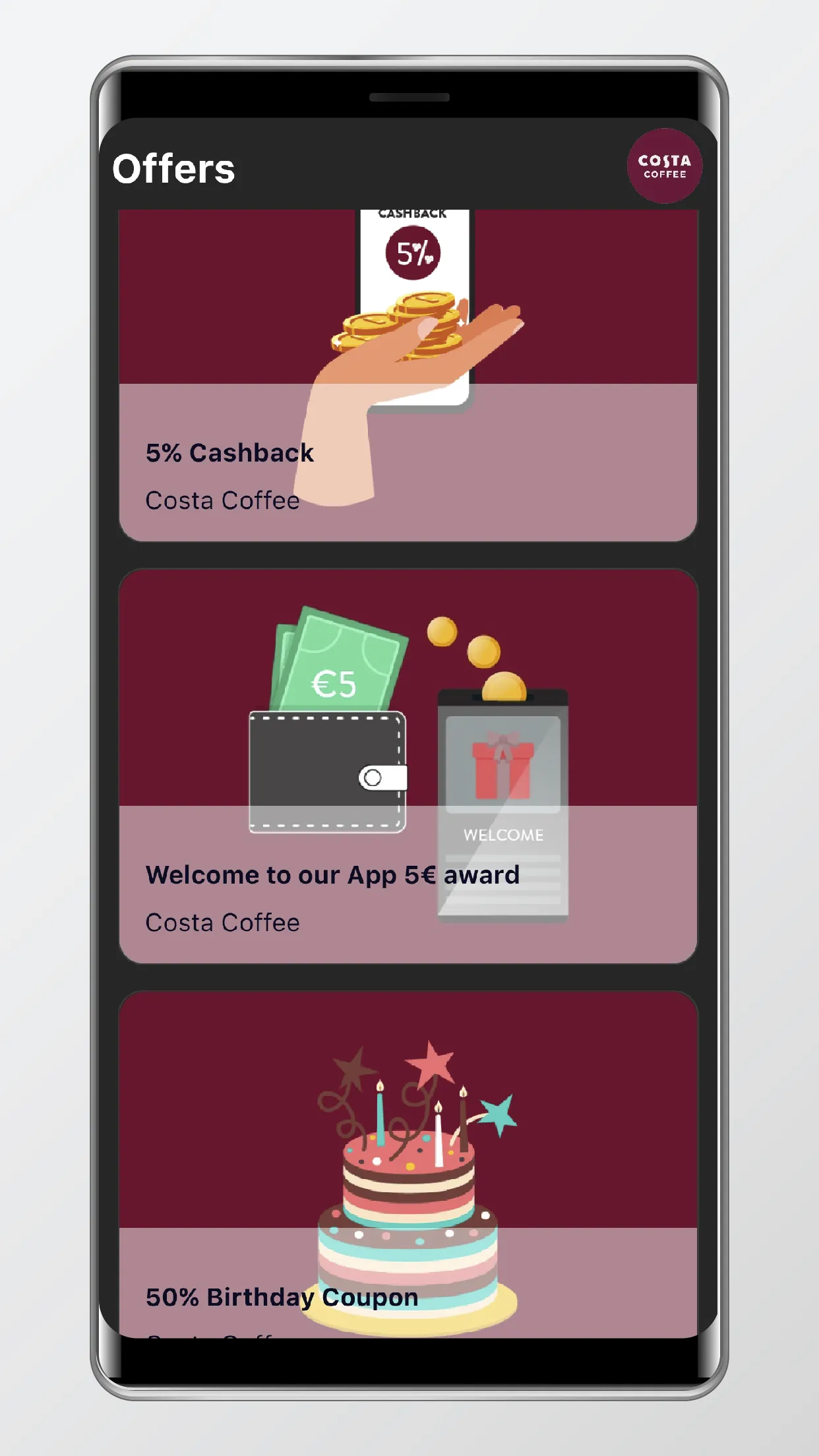 The Costa Coffee Club Cyprus App offers you the possibility to enjoy all the benefits of our loyalty program in an easy way, through your smartphone. Additionally, through the App you can have immediate information about: * your awarded cashback balance * your progress towards achieving Gold Status * your latest transactions in Costa Coffee Cyprus stores Download now the Costa Coffee Club Cyprus App and get 5€ in cashback, that can be redeemed in coffee beverages in our stores!