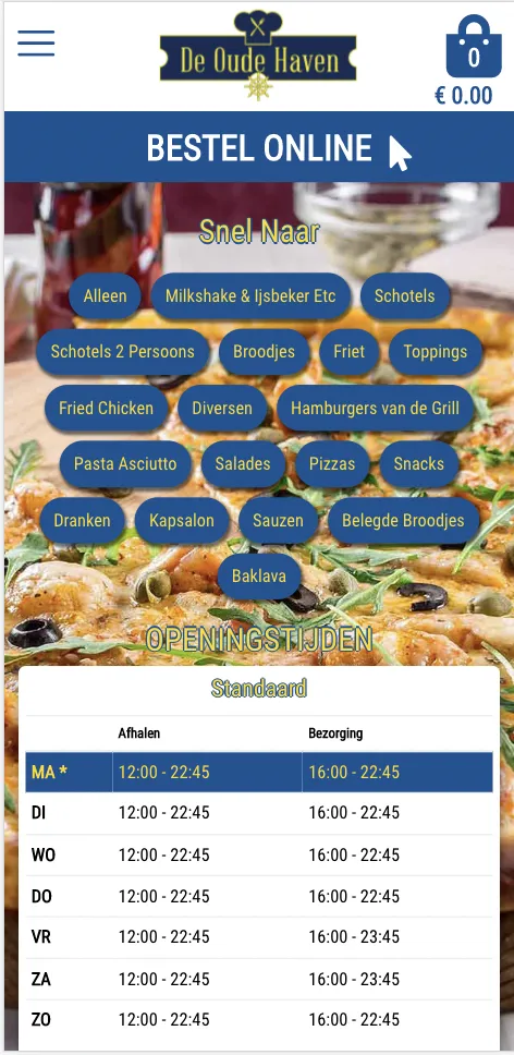 Order now easily and super fast via our order app. Orders placed in no time. - Pay online with IDeal. - Fast data entry. - Automatically take advantage of promotions and offers. We wish you a lot of ordering convenience and a very tasty meal. Pizzeria Cafeteria Grillroom De Oude Haven Millingen aan de Rijn Pizza, Pasta, Shoarma, Dishes, Sandwiches, Fries, Snacks, order food online