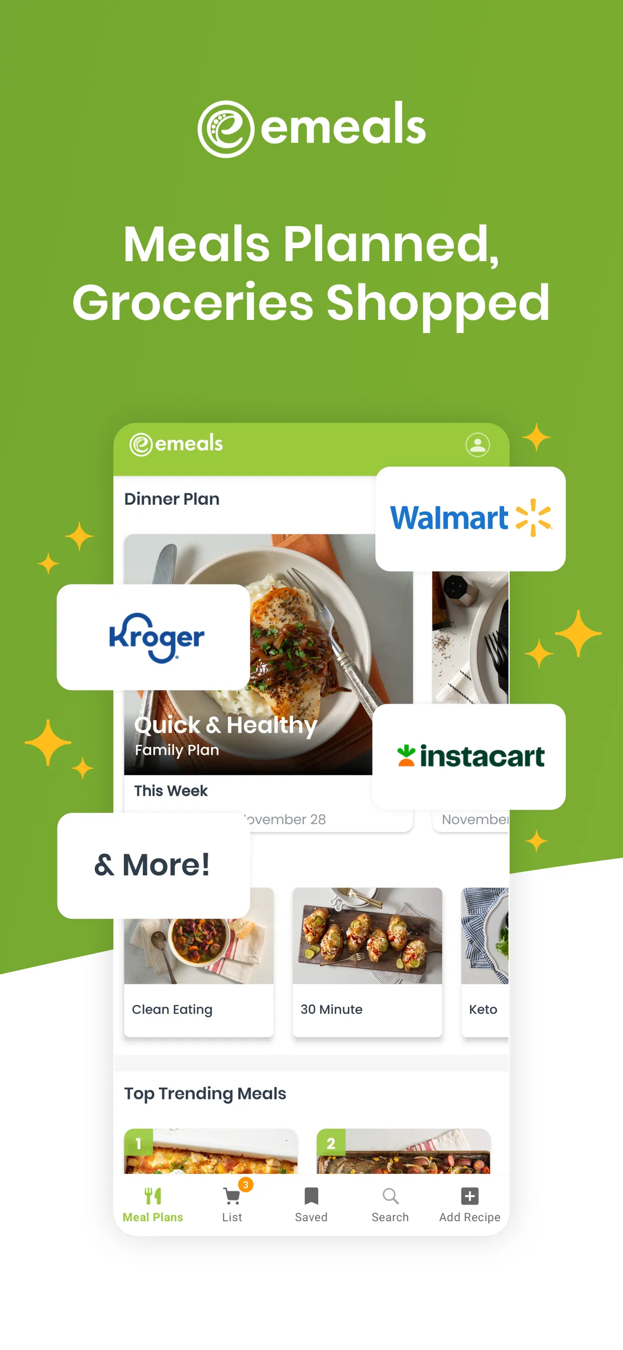 eMeals is the quickest way for busy families to get dinnertime solved. With 15 different meal and diet plans there is sure to be enough recipe inspiration to please even the pickiest eater. Save time by sending your customizable shopping list ingredients to one of our online grocery delivery or pickup partners. The Benefits of our Healthy Meal Planning: >Stress-Free Weekly Meal Planning Our meal planning service helps add variety & save you time. Each week we send you 7 new recipes to limit the overwhelming feeling of searching the internet or cookbooks trying to find new recipes for your family. As you select your meal recipes for the week, our planner is automatically creating an interactive grocery shopping list. If you don’t see recipes on this week’s plan you like, search previous meal plans, other food style plans & bonus meal collections published throughout the year for extra meal inspiration....