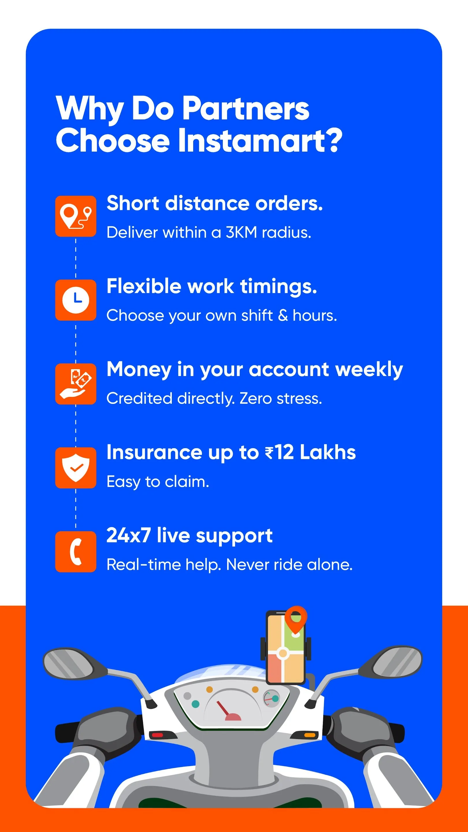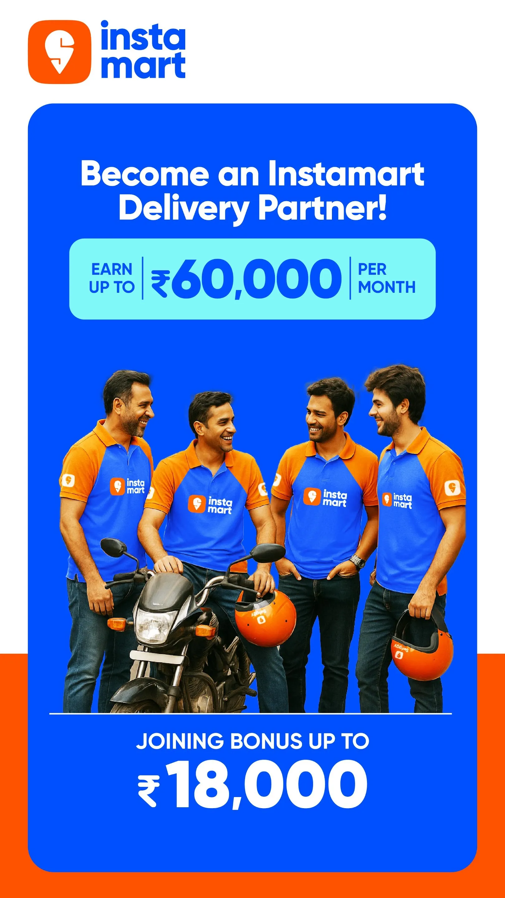 Join Swiggy Instamart as a Delivery Partner 🚴♂️ Earn up to ₹60,000 every month with up to ₹15,000 joining bonus and weekly payouts. Deliver within 1-3 km across 130+ cities and 1200 stores as an Instamart delivery partner. Instamart is India’s leading grocery delivery & essentials delivery platform. Swiggy Instamart Delivery Partners earn up to ₹60,000 per month with up to ₹15,000 joining bonus and additional daily incentives. Plus, you can refer friends who are searching for delivery jobs, and earn extra rewards in our delivery partner app. ...