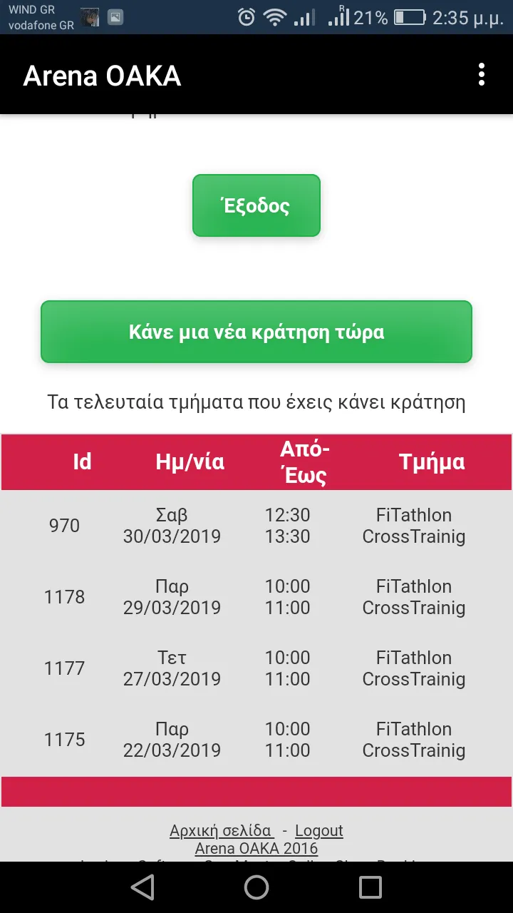 Online booking for members of the Arena OAKA gym. Members can book groups, view their programs, subscribe, any remaining balance, and their presence