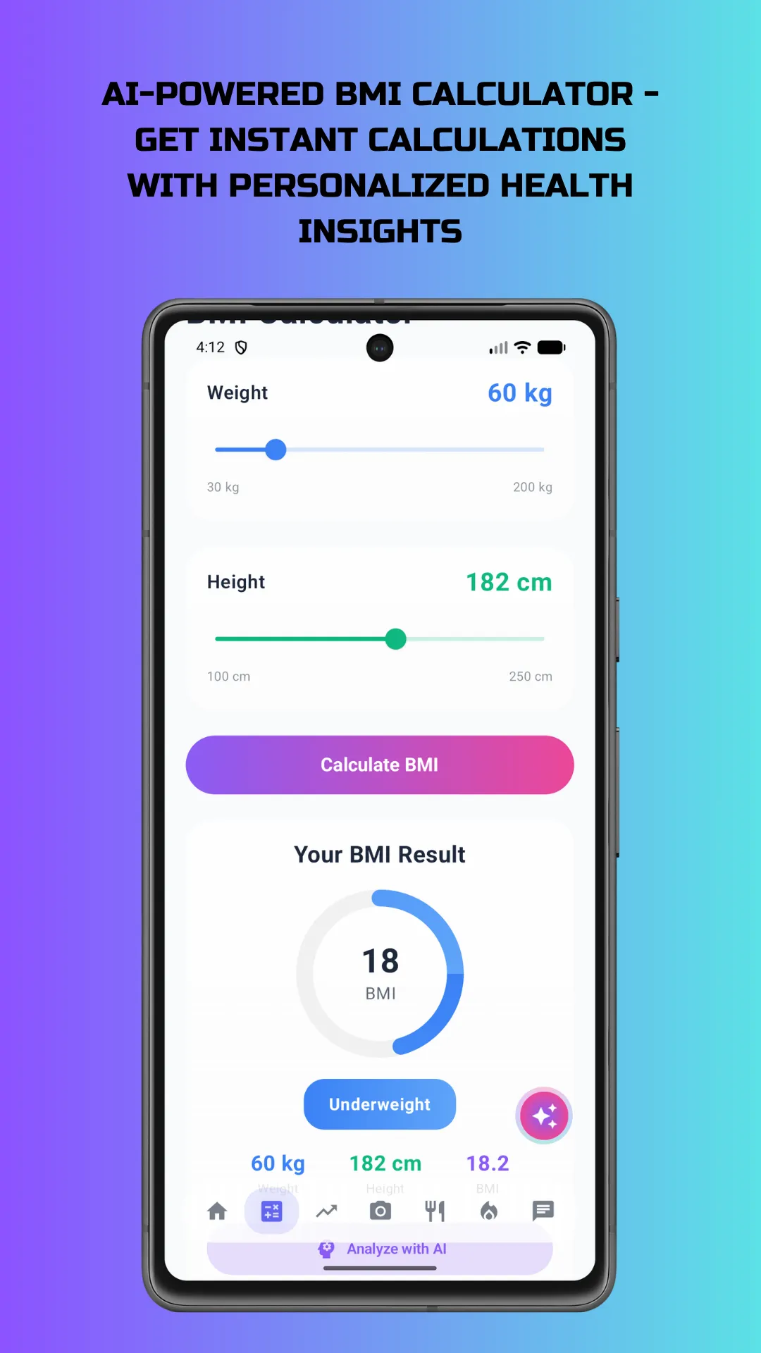 Transform your health journey with BMI Pro, the most comprehensive AI-powered health and fitness app. Calculate BMI, track calories, monitor water intake, analyze sleep patterns, and get personalized AI health insights—all in one beautiful, privacy-focused app. 🤖 AI-Powered Health Assistant Chat with your personal AI health expert for instant advice, nutrition tips, and wellness guidance. Get personalized recommendations based on your health data. 📸 Smart Food Scanner Scan any food item with your camera for instant nutritional analysis. Get calories, macros, and nutrition facts in seconds. ...