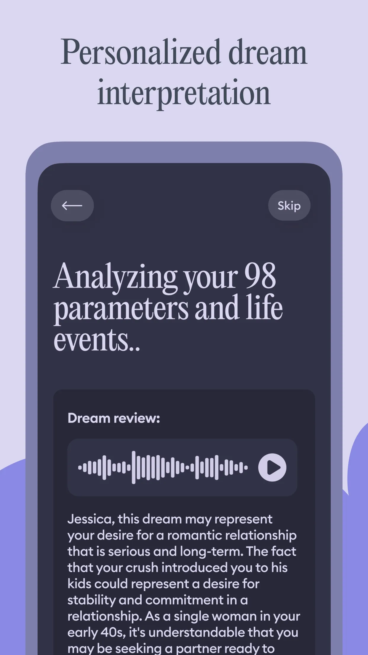 Dream Meanings, Interpretation, and Journal | Explore dream themes (Dictionary) | Find mental clarity So, what do those strange dreams mean? How to interpret it? With personalized meanings and therapist guidance, get to know your dreams and yourself at a deeper level with the dream interpretation app. Grounded in tradition and backed by science, we delve into your dreams so you can understand your subconscious mind. DreamApp is a companion who will listen in a friendly manner, give advice, and connect the dots between your dreams and your life....