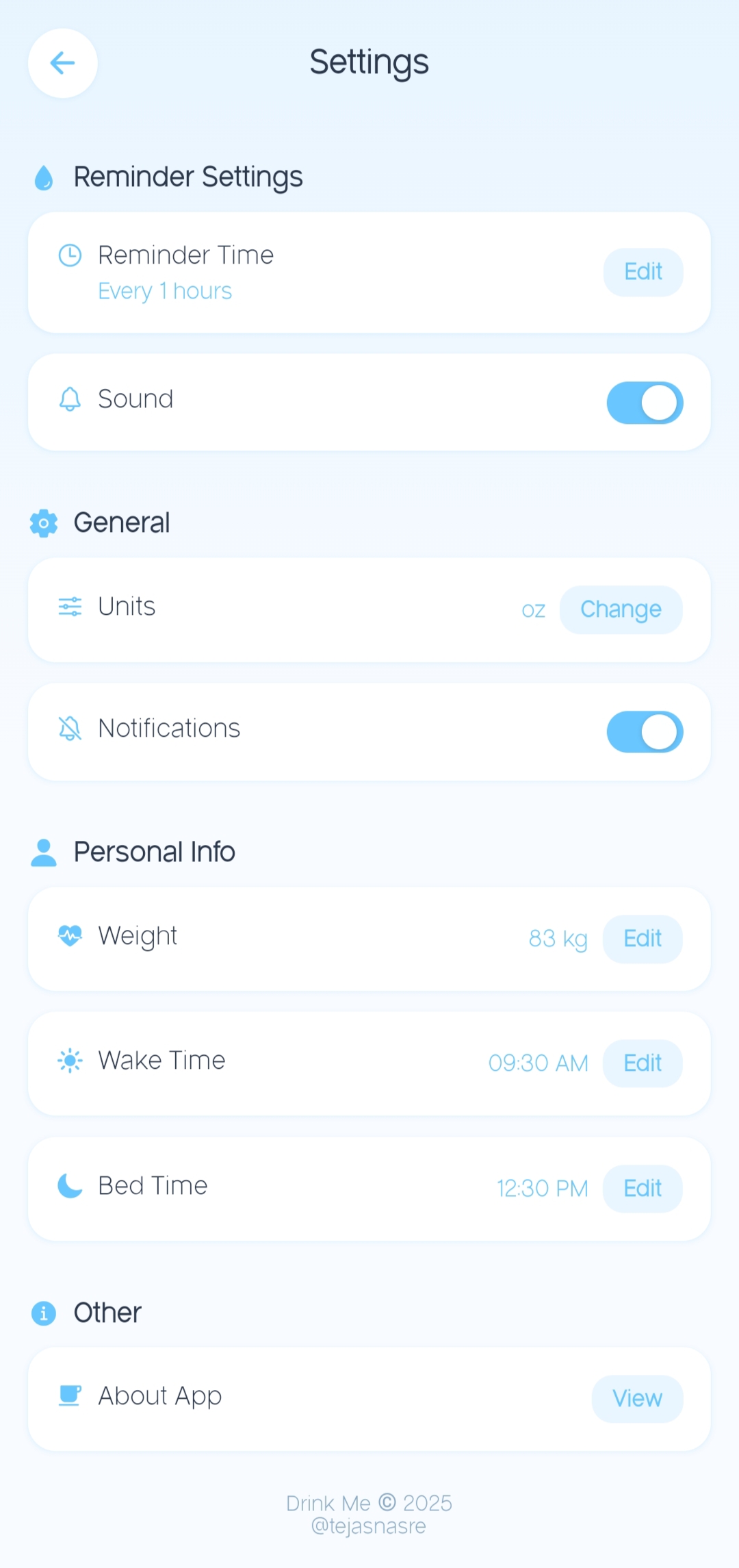Stay hydrated and healthy with DrinkMe — a simple app designed to track your daily water intake and remind you to drink water at the right time. Key Features: Personalized hydration plans based on gender, weight, and routine Smart reminders throughout the day based on your wake-up and sleep time Daily water intake tracker with progress updates...