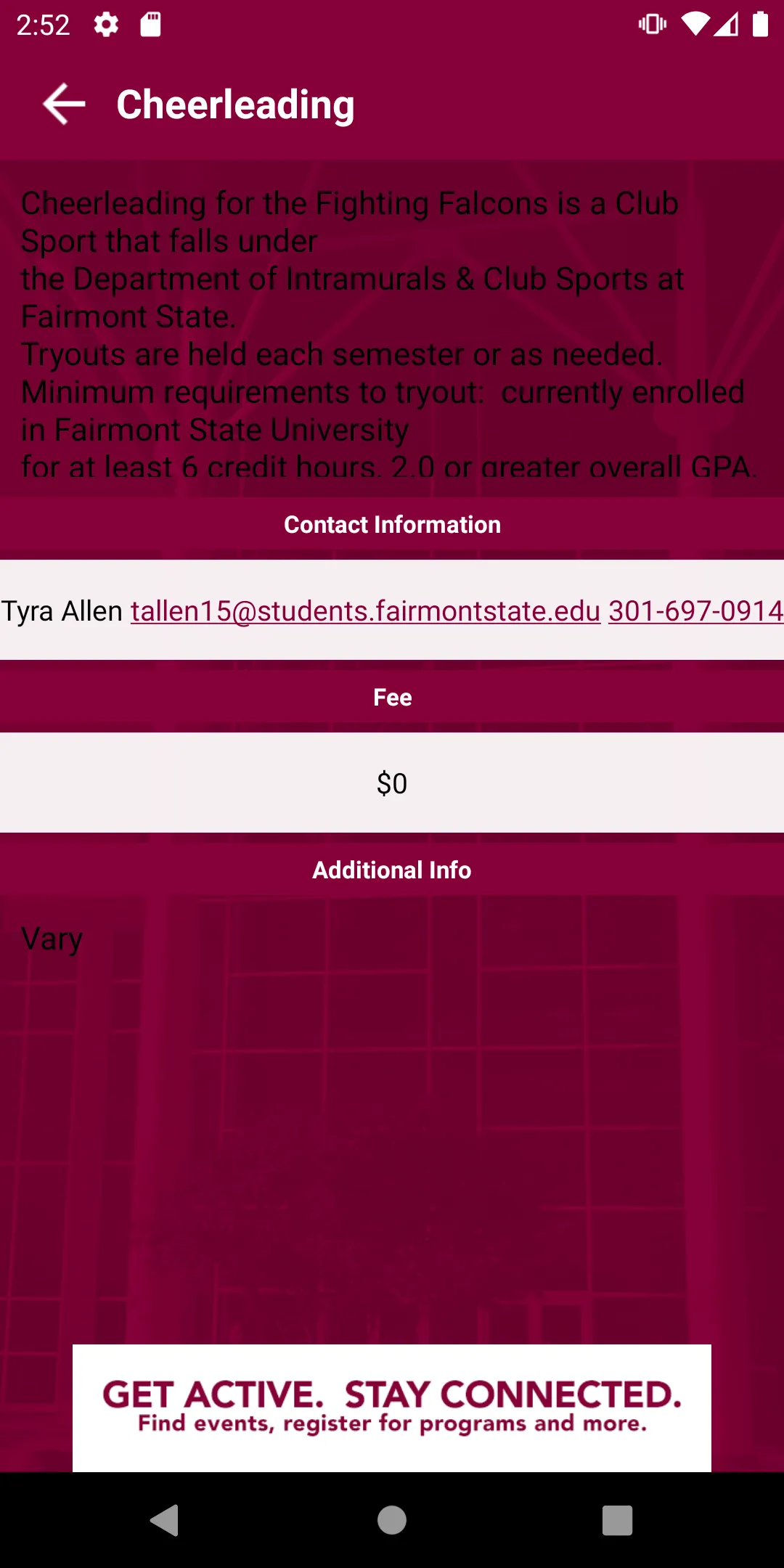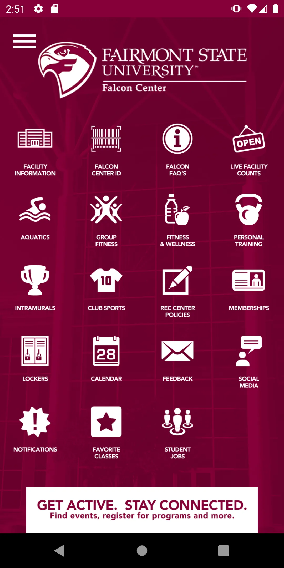 Welcome Home to the Fairmont State University Falcon Center. Available at your fingertips, this app provides you detailed information on the many amenities available within the Falcon Center. You will find information about memberships, lockers, fitness and wellness programs, aquatic activities including swim lessons, parties and family swim. Additionally you can check out Intramurals and Club Sport programs, register for programs or classes as well as get updated facility hours, information ab...