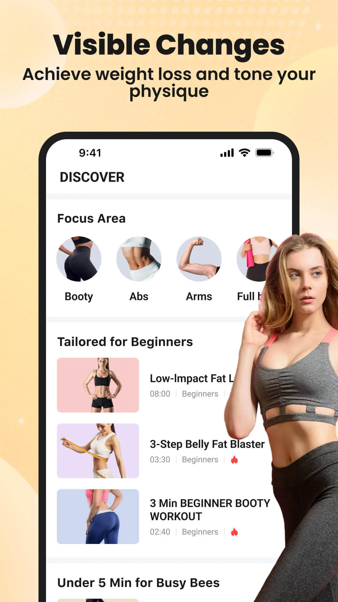 Discover a personalized program designed to help you achieve safe and effective weight loss from the comfort of your home. Our structured workouts and customizable meal plans provide a holistic approach to enhancing your health and fitness. Supported by scientific research, this program is proven to yield results. Stay dedicated, and you’ll experience a transformation that boosts your confidence and makes you feel more beautiful than ever. Our all-encompassing workout plan focuses on key areas like arms, glutes, abdomen, and legs, enabling you to lose those stubborn pounds and shape your physique. With detailed animations and video instructions, you can maintain proper form throughout each exercise. The best part? No equipment is necessary, allowing you to conveniently fit your workouts into your day, whether at home or on the go. Start your body transformation journey today! Get Fit Anytime, Anywhere - No Equipment Required! This straightforward program takes just 4-8 minutes of your day, making it easy to adhere to. As you embark on your weight loss journey with us, you’ll see visible changes. Are you ready to begin? ...