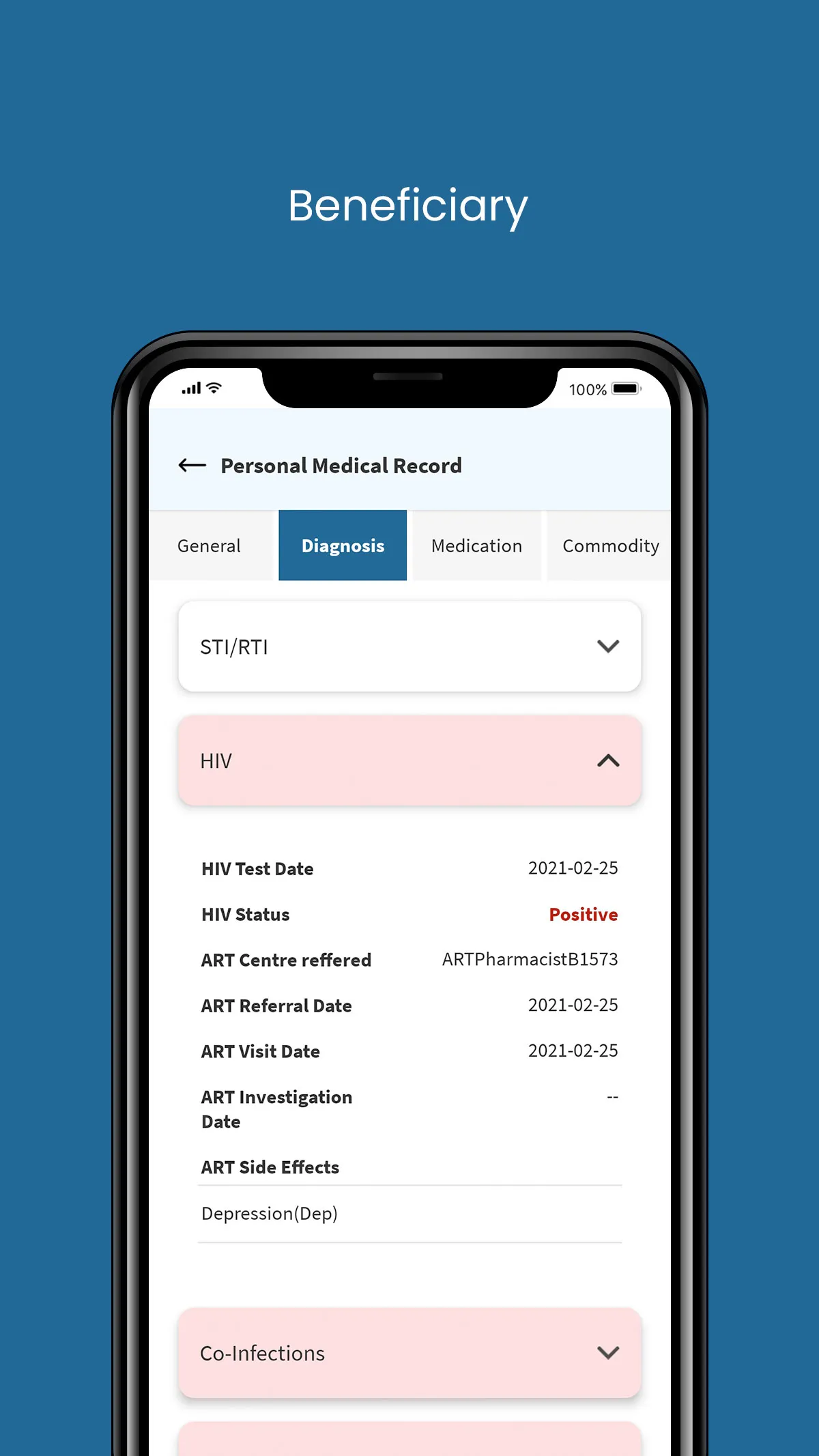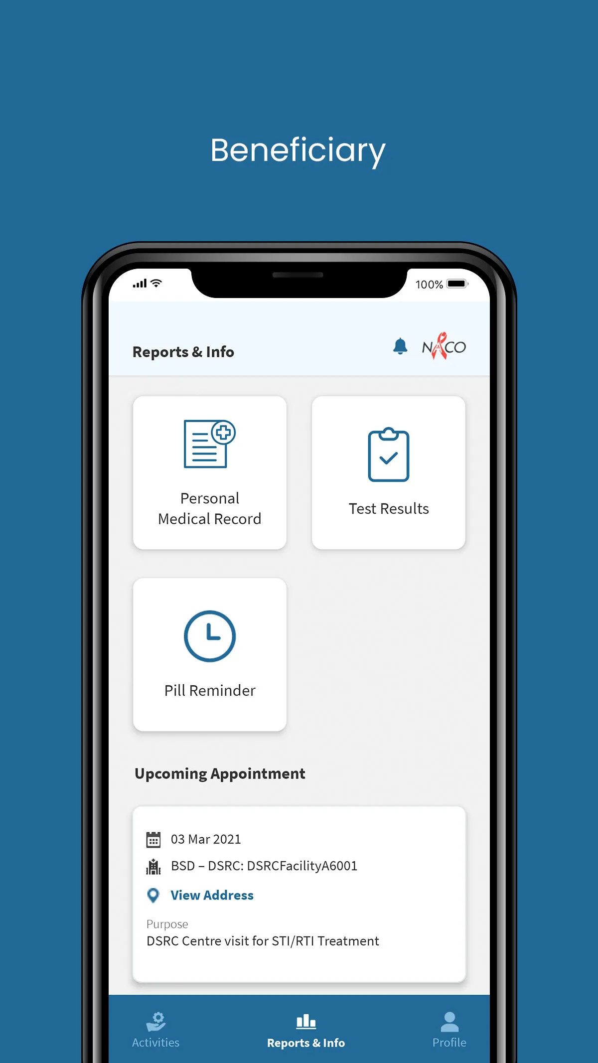 This application caters to four different logins, three of which (OST Nurse, FICTC Counsellor and TI Outreach Worker) are healthcare staff and the fourth login is for all beneficiaries registered in the HIV ecosystem through SOCH web application. A) Beneficiary Application: The beneficiary login works with Phone number of beneficiaries registered on the SOCH web portal through any of the facilities (TI Center, STI/RTI Clinics, ICTC Center and/or ART Center) in HIV Continuum of care. All beneficiaries will be able to 1) See their PersonalMedical Records 2) Book an online appointment at any of the registered facilities. 3) Set Reminders for medicine and also check any follow-up appointment from healthcare staff. B) F-ICTC paramedic staff : The app has been built to facilitate the end users to record reactive clients and refer them to ICTC for confirmatory tests in order to strengthen the F-ICTC to ICTC linkage. The app also records the monthly report for the specific F-ICTCs which has to be submitted to their parent ICTC Centre for clear visibility of both beneficiary and inventory service delivery....