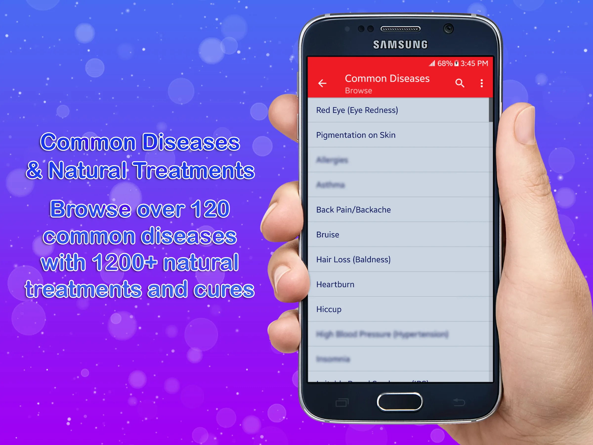 Quick, safe, and effective treatment of most common diseases, ailments and illness. Common Disease and Natural Treatment is a complete guide for more than 120 common diseases, ailments and illness with extra information about each disease such as its causes, symptoms and cures. Most of the non life threatening illness can be treated at home. Common Disease and Natural Treatment is safe and useful for the common diseases and ailments. Learn how you can use natural cures (alternative medicine or herbal cure) to replace many of the most commonly used over-the-counter drugs in the treatment of common ailments. If you use home remedies wisely, it will save your time and money. Hope this app helps you to find your own path of healing through natural remedies. Common Disease and Natural Treatment is perfect companion when you need quick and natural remedies for common health alignments. All remedies suggested in the application are natural, ayurvedic and the ingredients, commonly available and are based on Ayurveda. Think of it as having instant access to a handbook of natural home remedies & cures right on your mobile, available anytime and anywhere. ...