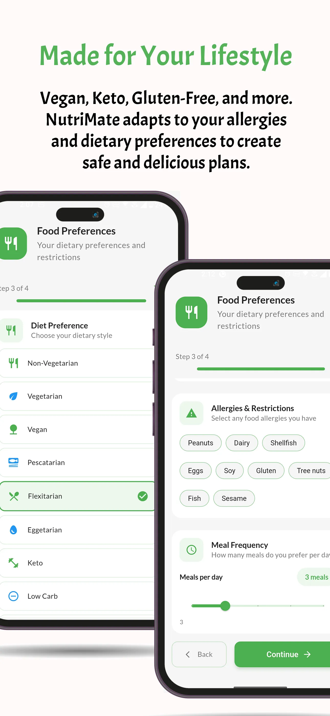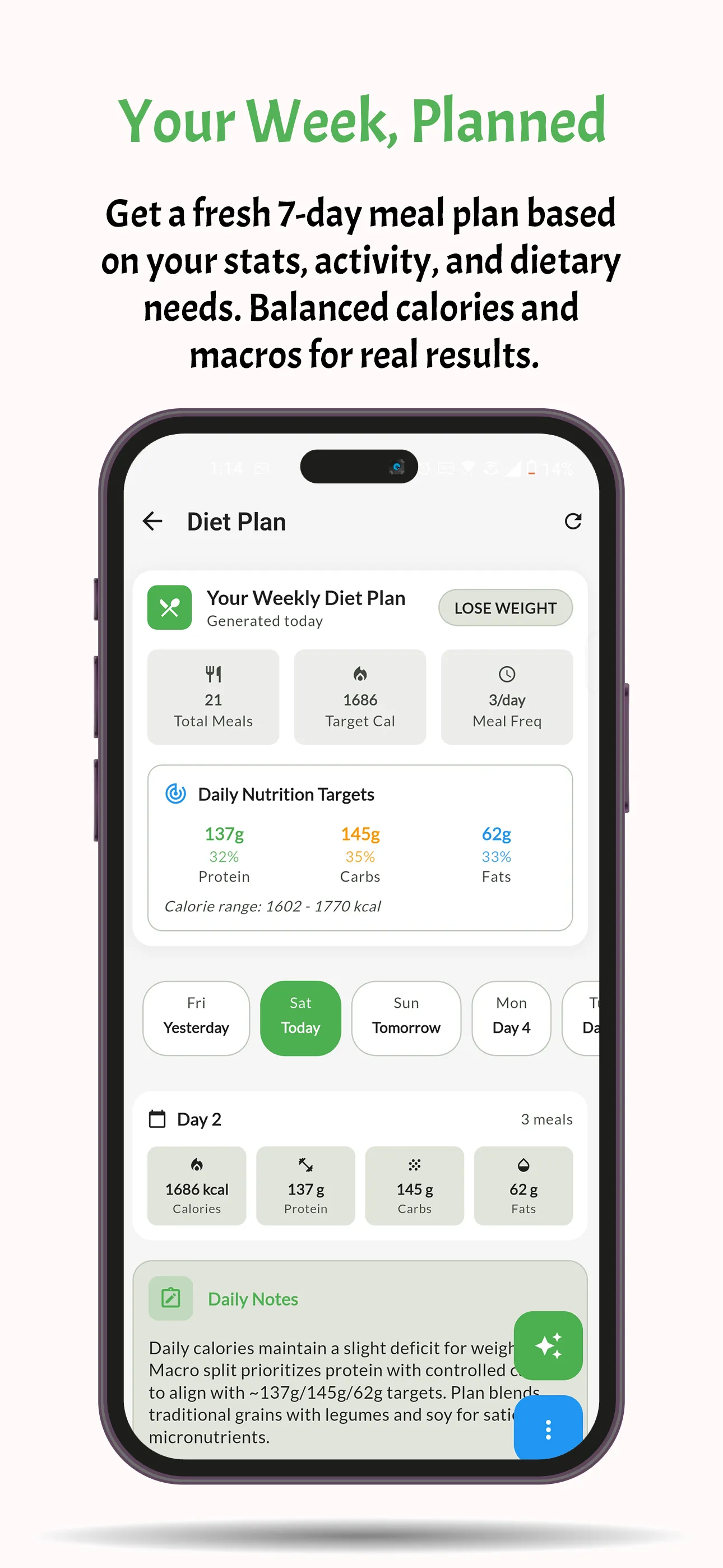 NutriMate is your AI-powered nutrition companion. Get personalized 7‑day meal plans, generate custom recipes for your goals and preferences, and track your progress—all in one simple app. Whether you want to lose weight, build muscle, or eat healthier, NutriMate adapts to your stats, activity, diet style, allergies, location, and budget to create plans you can actually follow. Why NutriMate Personalized: Plans created from your age, weight, height, gender, activity level, goals, diet preferences (vegetarian, vegan, keto, etc.), allergies, and budget Practical: Ingredient lists and clear steps tailored to your skill level and local foods...