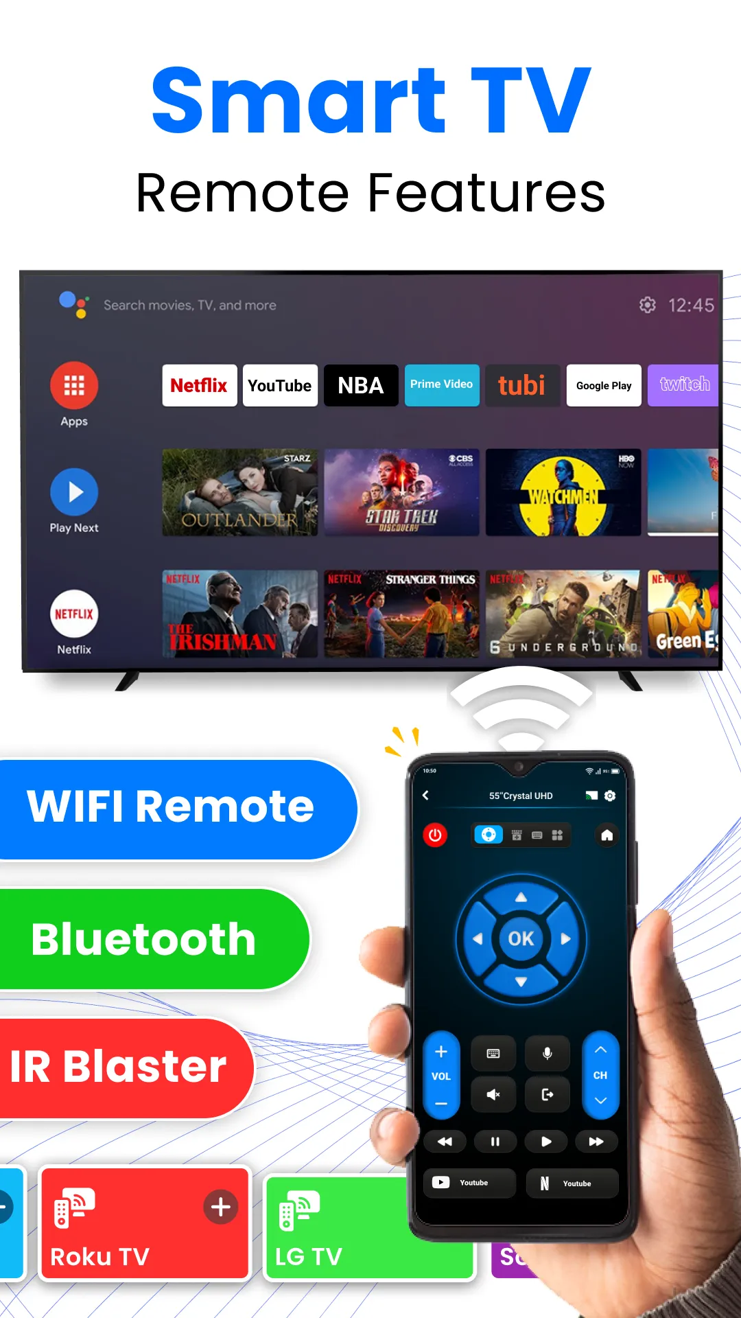 Lost your android TV remote again? Universal TV Remote is a powerful and easy-to-use remote control app that turns your Android phone into a complete TV remote app. Whether you prefer a Wi-Fi remote, Bluetooth remote, or infrared control, this TV remote app gives you smooth and reliable control over your television. With its clean design, this universal TV remote control app removes the need for multiple remotes. Just open the app, connect your TV, and take full control within seconds. From everyday viewing to smart features, everything is designed for comfort and simplicity. ...